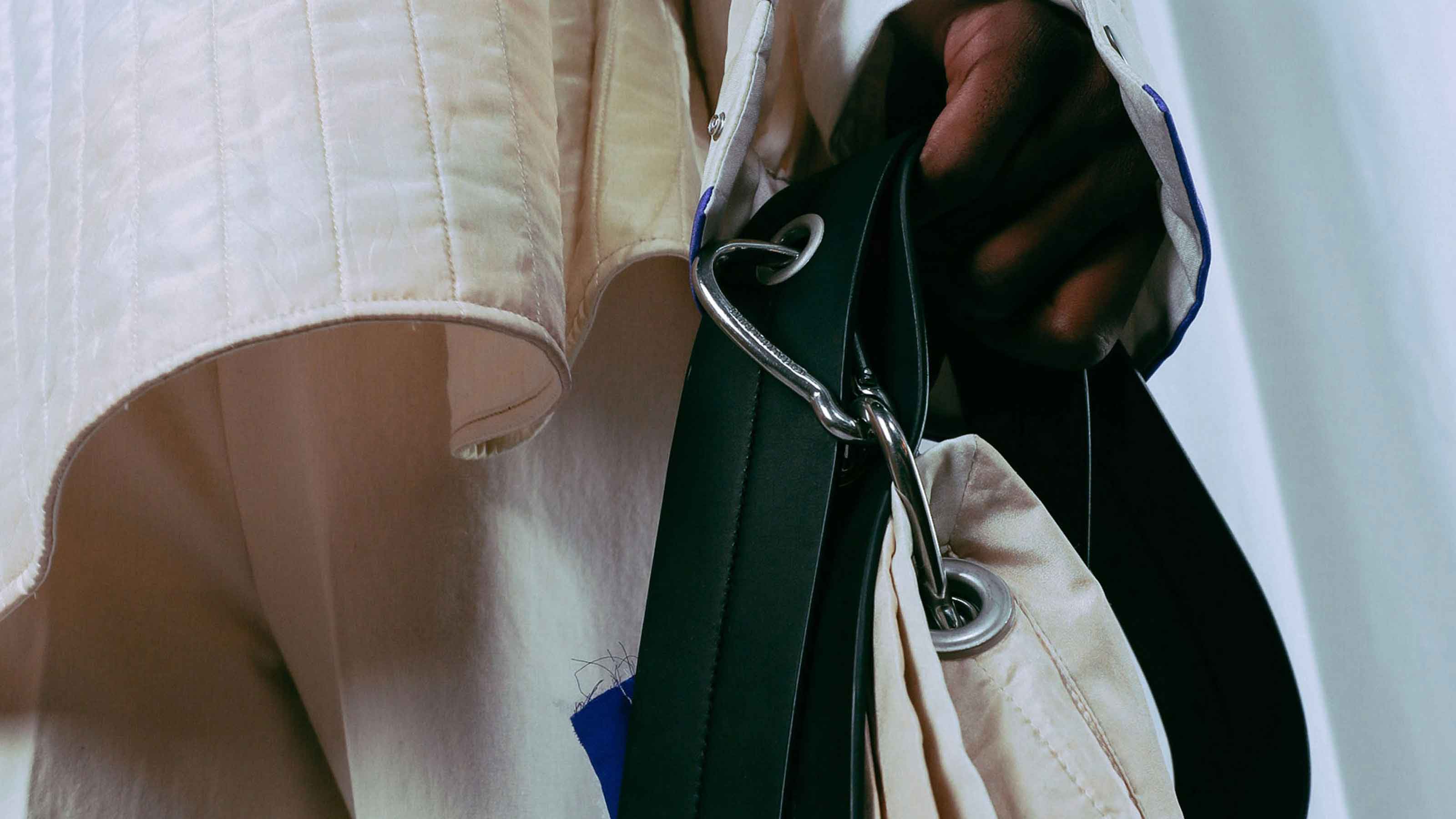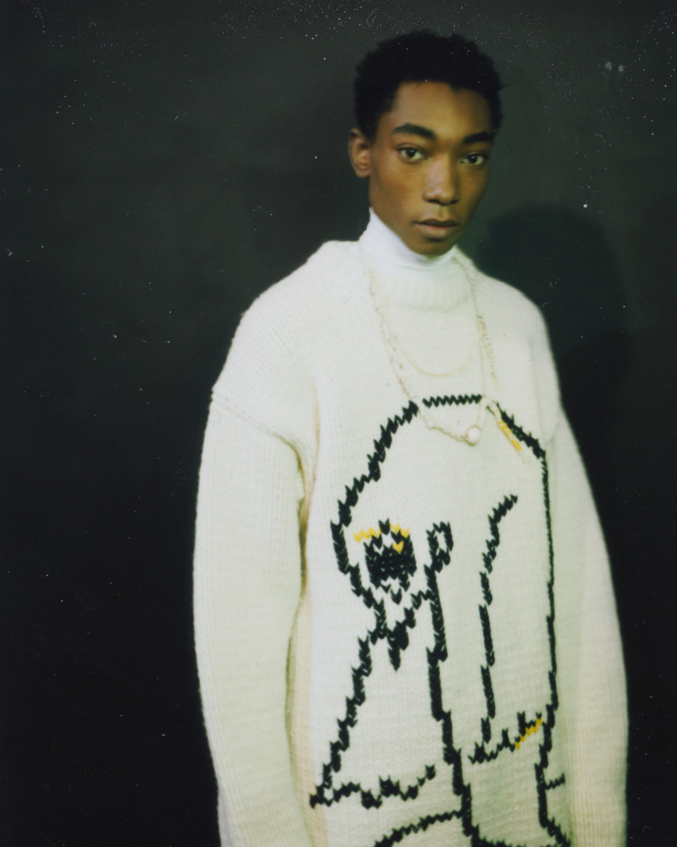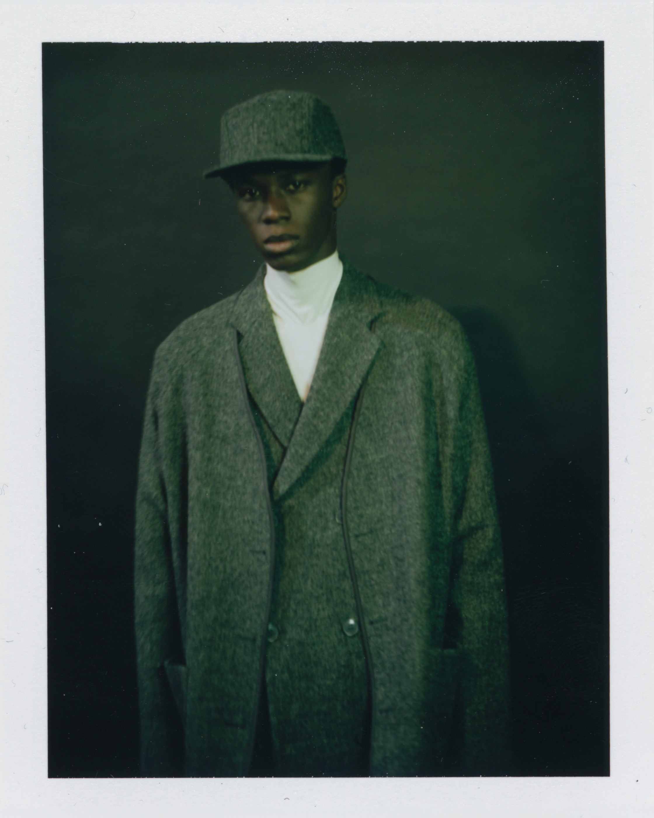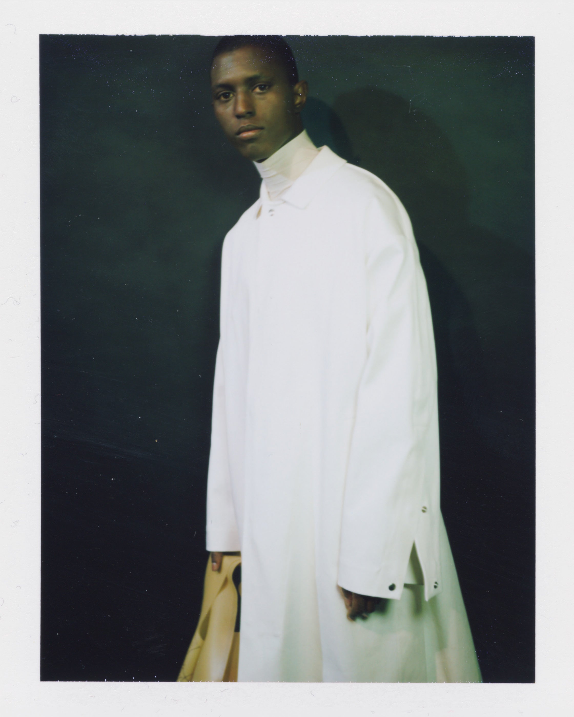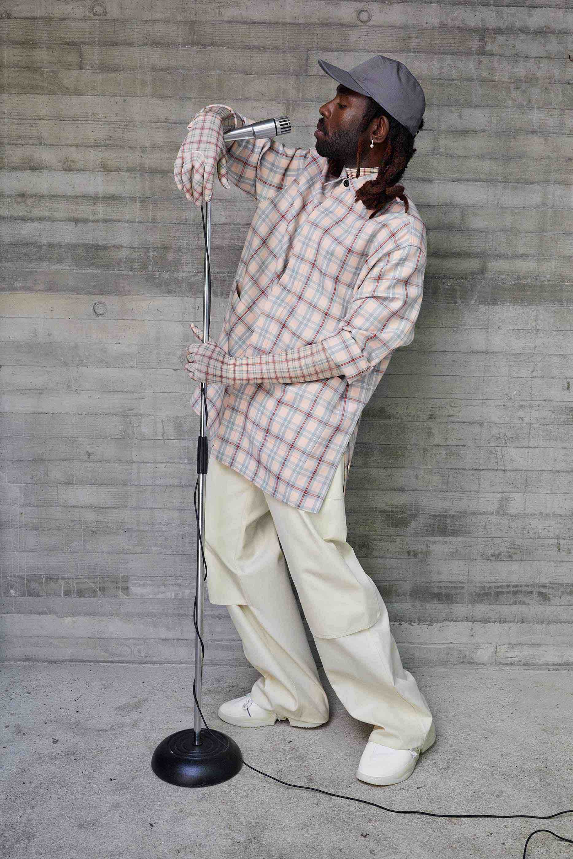 登山服やアルペンワードローブの原型を、モダンさかつ実用性を重んじる感性で改造しました。シルエットは、インパクトを高め、立体的で丸みのあるラインに仕立てています。幅も長さもたっぷりした点が特徴的です。モノクロームのトータルルックで重点が置かれているのは形状とアウトライン。軽やかでパリッとしたコットン、シャープなウール地、そして光沢の美しいレザーで仕立てられています。ショートパンツやトラウザーズには思いがけないオープニングやポケット遣いを盛り込み、ボリューム感を与えました。襟はネックライン上部まで伸びていますが、ジッパーで解放感を演出しています。内部にはコントラストの彩りが流れるようなマチが現れます。ジャカードやインターシャのニットにはロゴやスローガンを編み込み、シンプルなアウターウェアのブランディングの意義を職人の手練へと変化させました。テーラリングは力強く、直線的です。