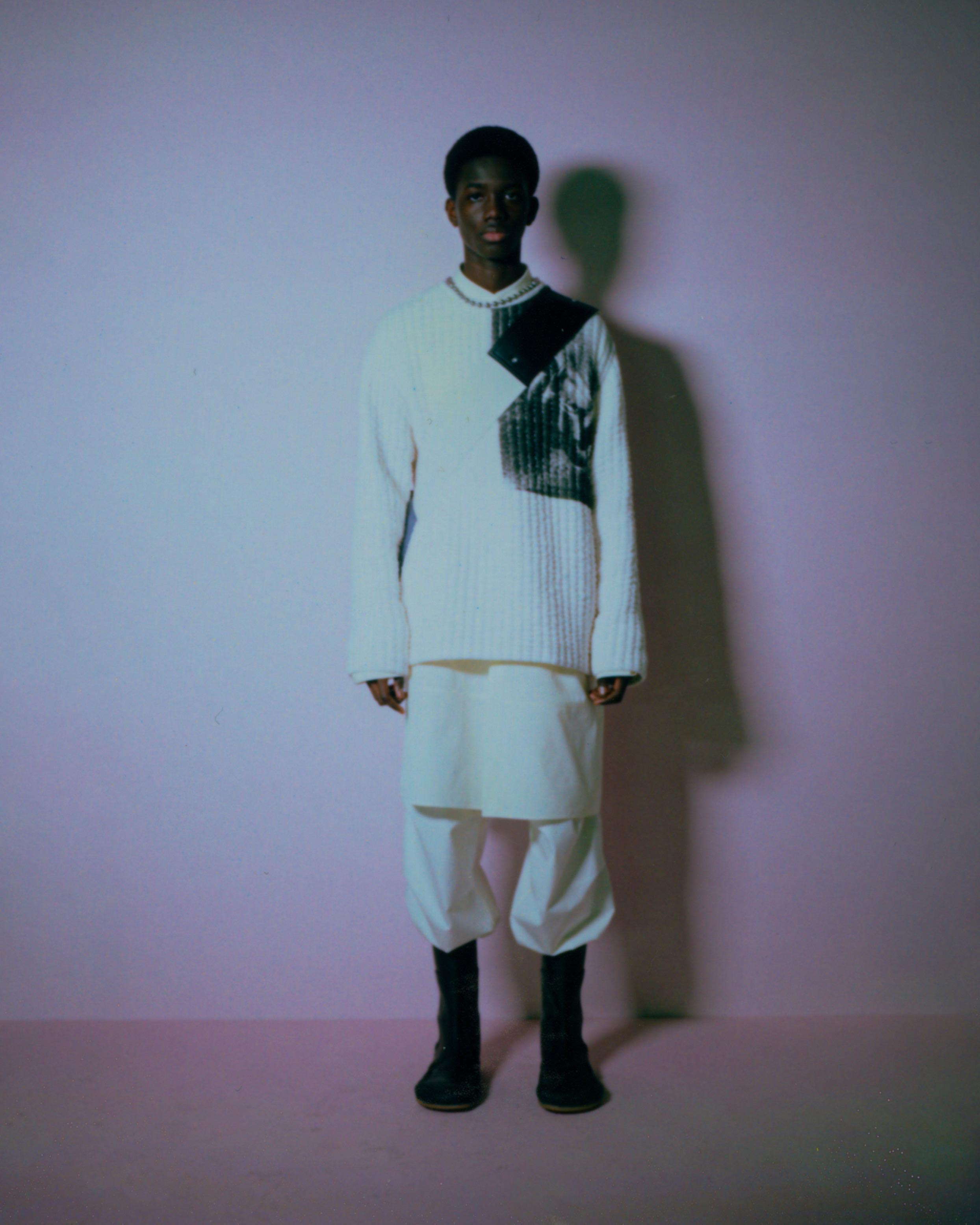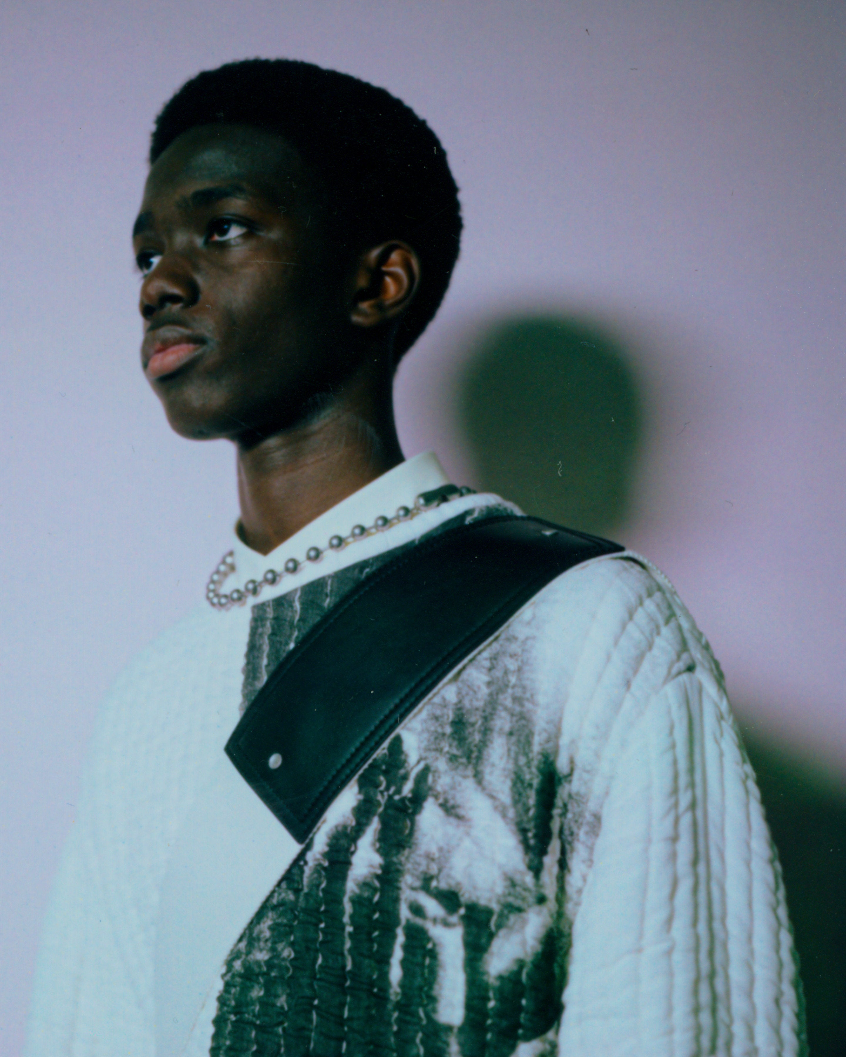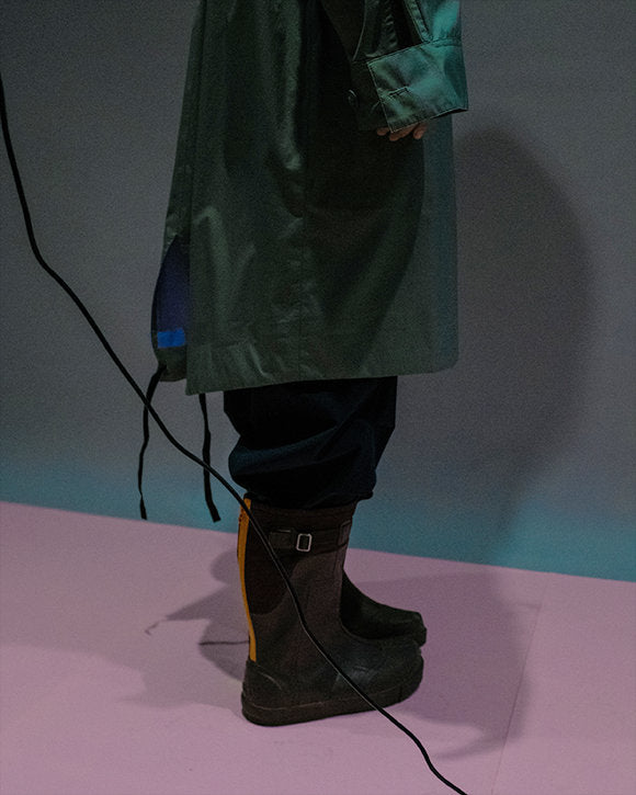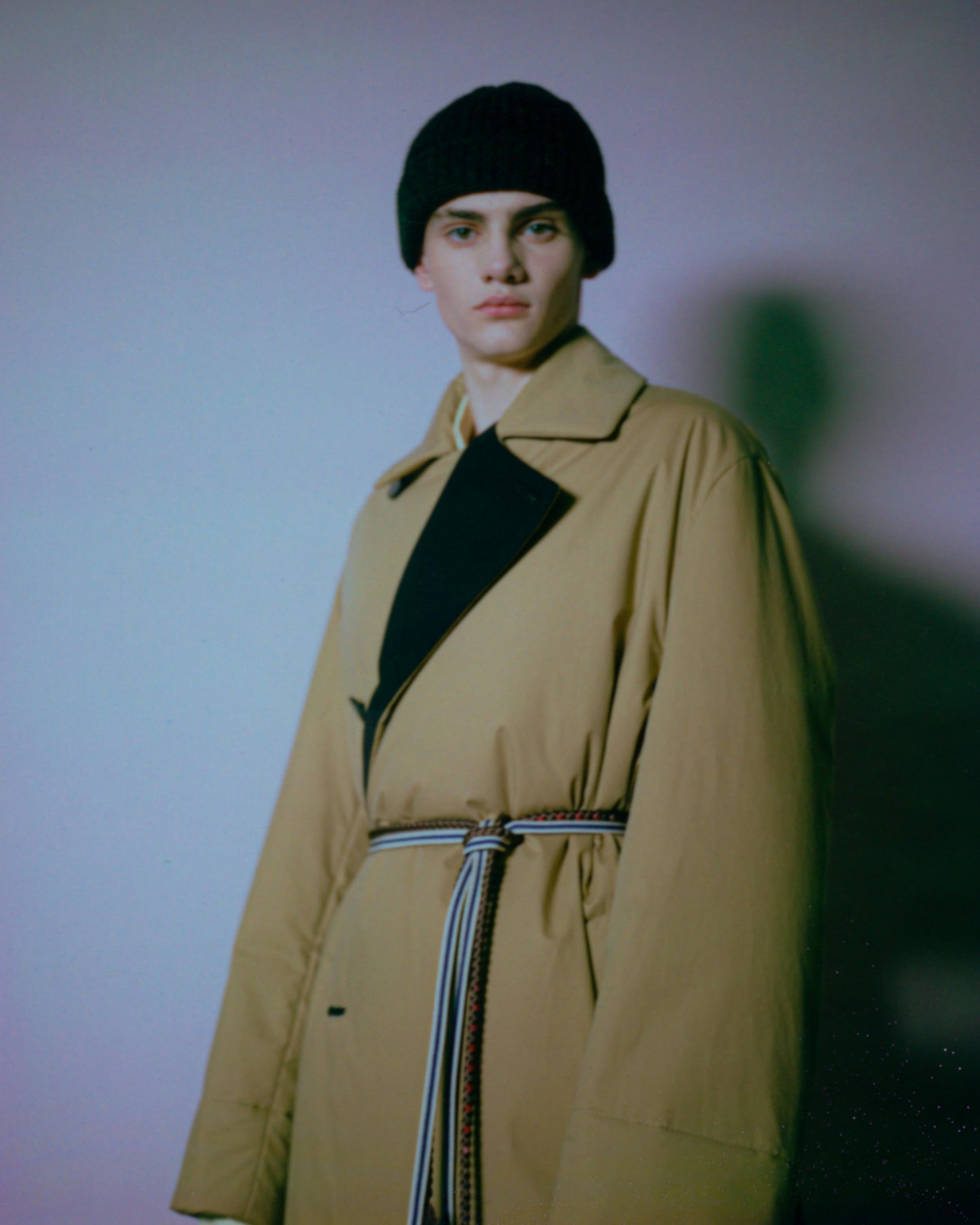 ソフトさの可能性を探り、コンパクトなコットンにあしらった縦向きのキルティングが長さを強調した優美なラインを描く一方、ミリタリー調を際立たせるガーメントダイナイロンのキルティングは、オーバーサイズの丸みのあるシルエットや、しまったシルエットのダーツ入りトラウザーズへとかたちを変えていきます。総バルカナイズド仕上げのハンマーヘッドトゥ付きブーツで、保護力を強調しました。高機能コーティング仕上げコットン製のふくらみを持たせたコート、フェルト化させたウールのトップコートには、日本から取り寄せた着物の帯を使用したベルトを付けています。森山大道氏による写真がコットンマトラッセや透かし編みニット地の上に重ねられ、コントラストが際立った現実と、柔らかく心地よい質感との対比を作り出しました。
