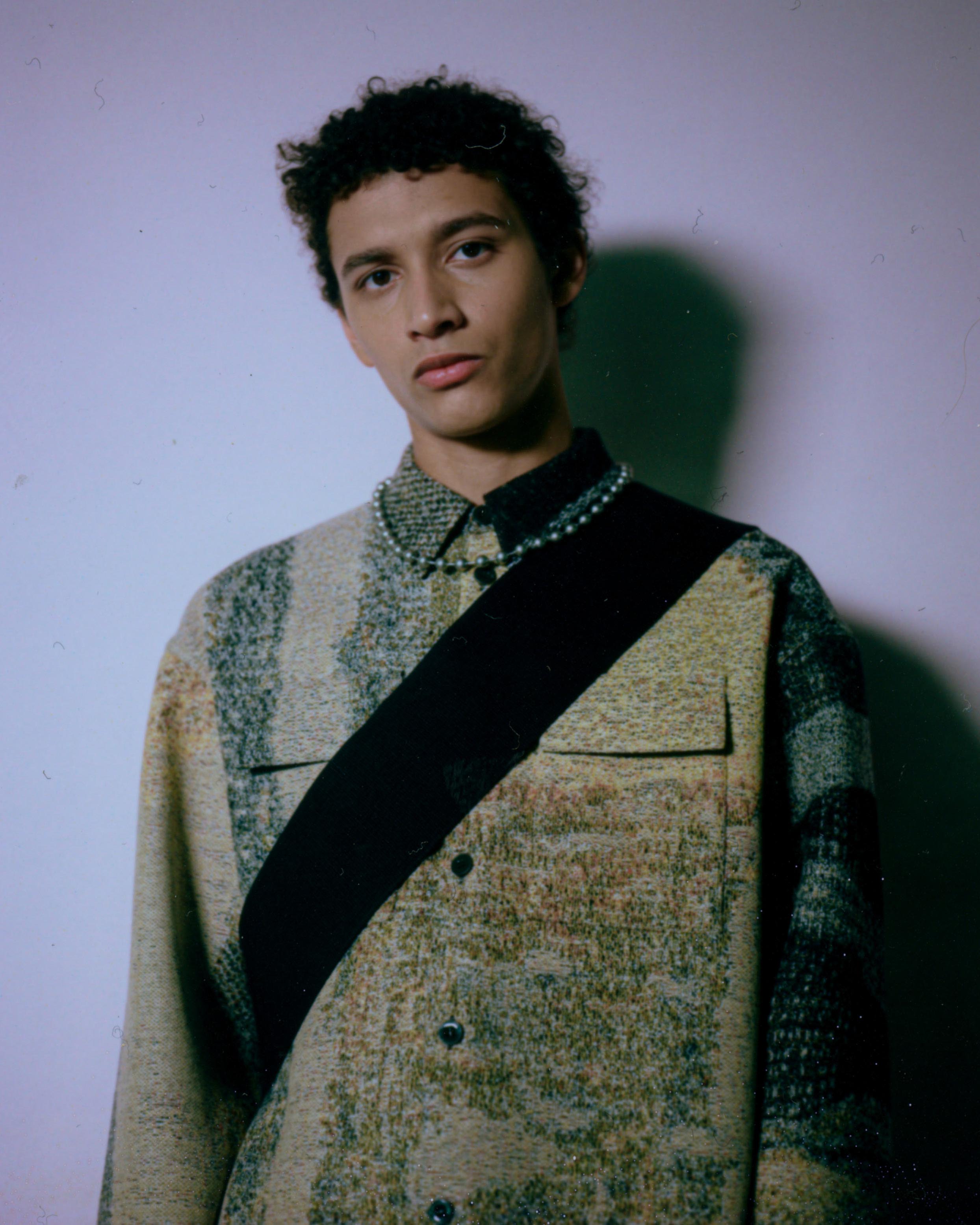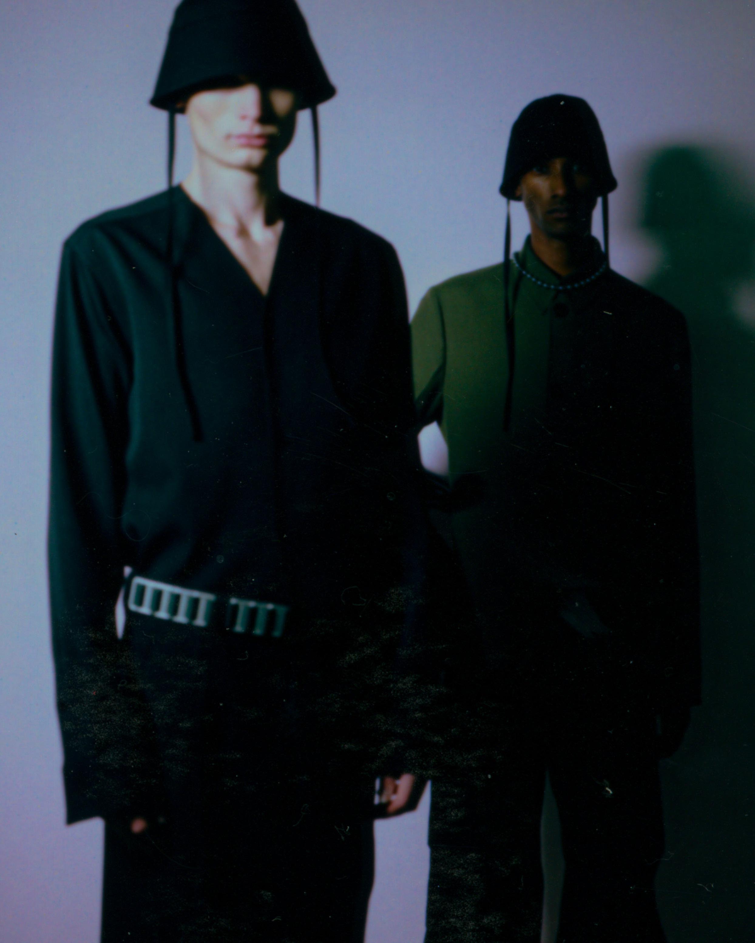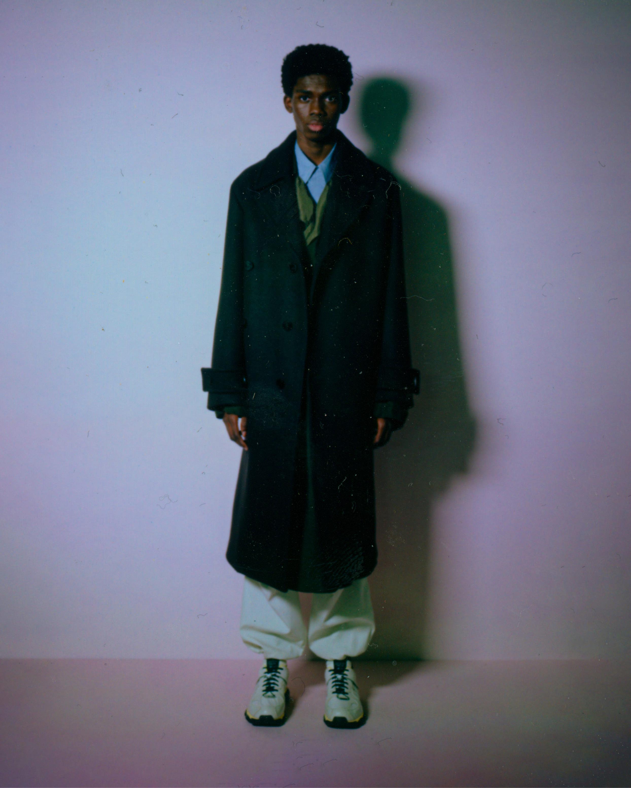 ソフトさの可能性を探り、コンパクトなコットンにあしらった縦向きのキルティングが長さを強調した優美なラインを描く一方、ミリタリー調を際立たせるガーメントダイナイロンのキルティングは、オーバーサイズの丸みのあるシルエットや、しまったシルエットのダーツ入りトラウザーズへとかたちを変えていきます。総バルカナイズド仕上げのハンマーヘッドトゥ付きブーツで、保護力を強調しました。高機能コーティング仕上げコットン製のふくらみを持たせたコート、フェルト化させたウールのトップコートには、日本から取り寄せた着物の帯を使用したベルトを付けています。森山大道氏による写真がコットンマトラッセや透かし編みニット地の上に重ねられ、コントラストが際立った現実と、柔らかく心地よい質感との対比を作り出しました。
