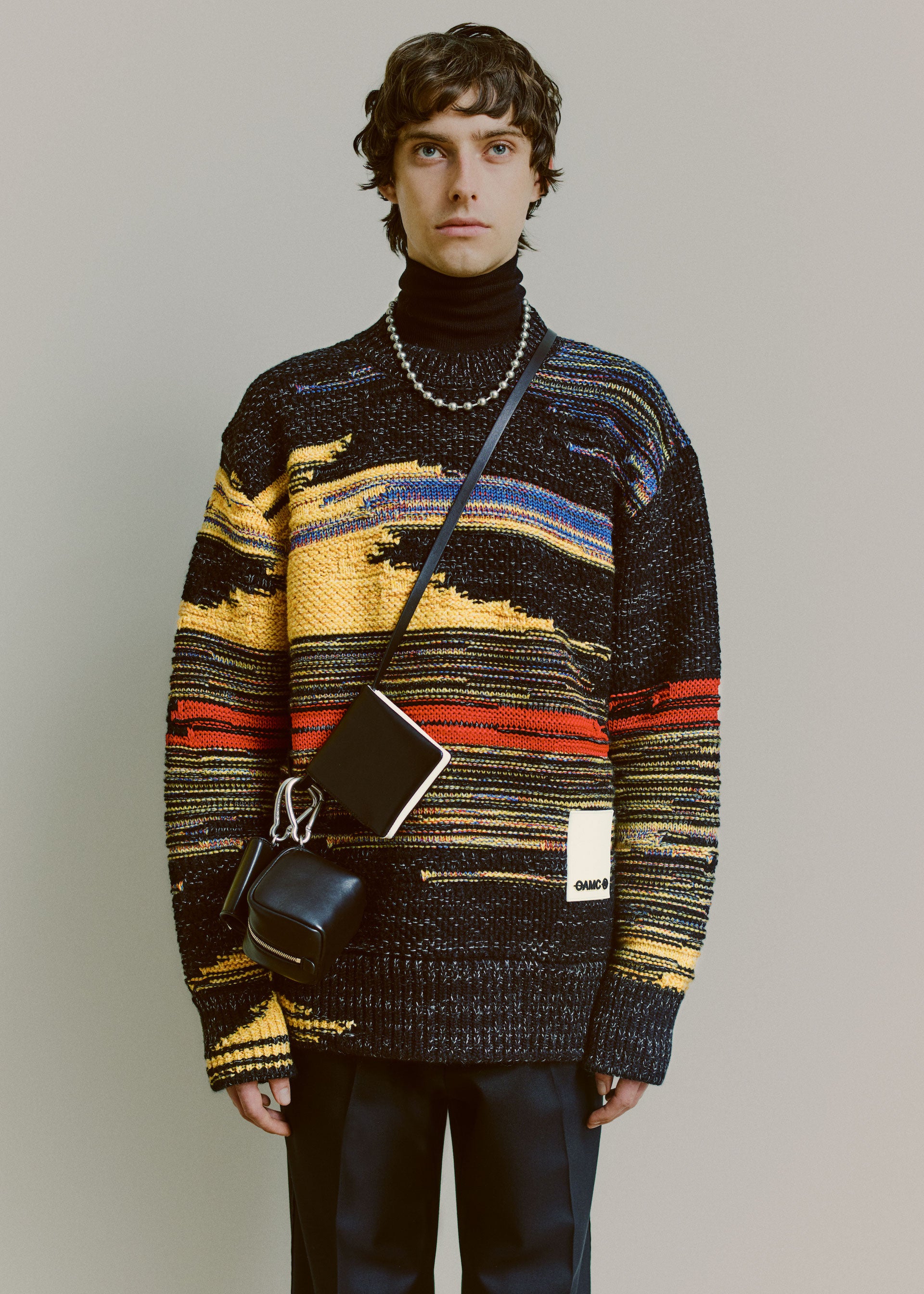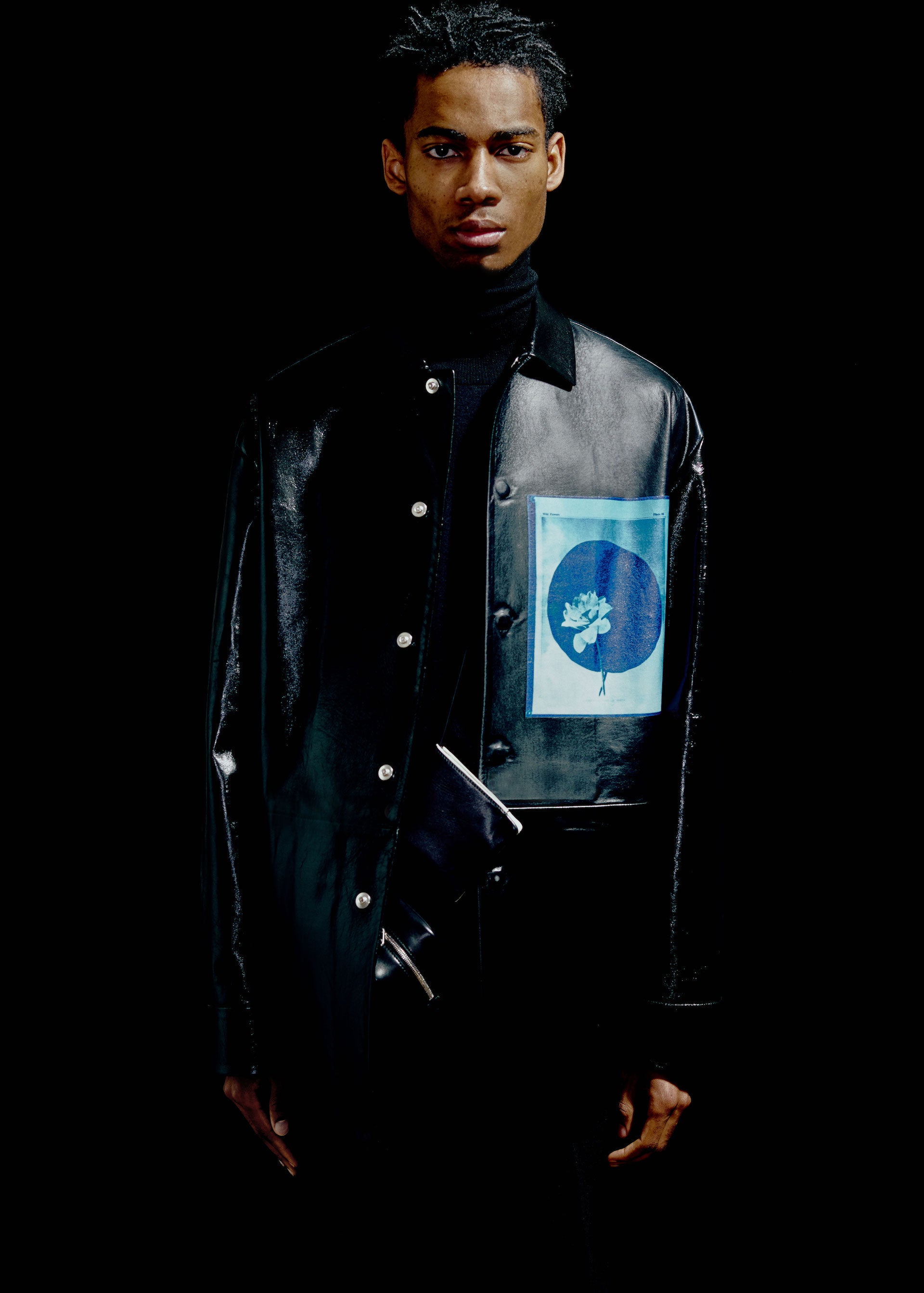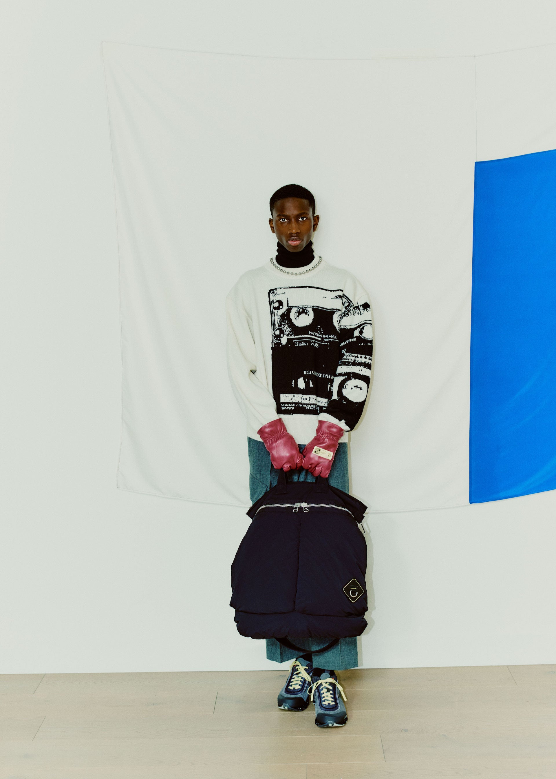 Collages and assemblages. In Rauschenberg’s vocabulary, ‘combines’. The idea of mixing materials, which Rauschenberg gained through his experience in his first year at the legendary black mountain college, under the guidance of Josef Albers. This idea is often at the root of design: finding the correct balance and vibration between two different materials, colors, or techniques, and was the initial starting point for the Fall/Winter 2021 collection. Mixed materials take the form of organza panels applied to sharp Japanese wool or cotton poplin overshirts, chunky knit collars attached to wool coats, and heavy metal hardware cutting through tailoring, shirting, footwear, and accessories.
