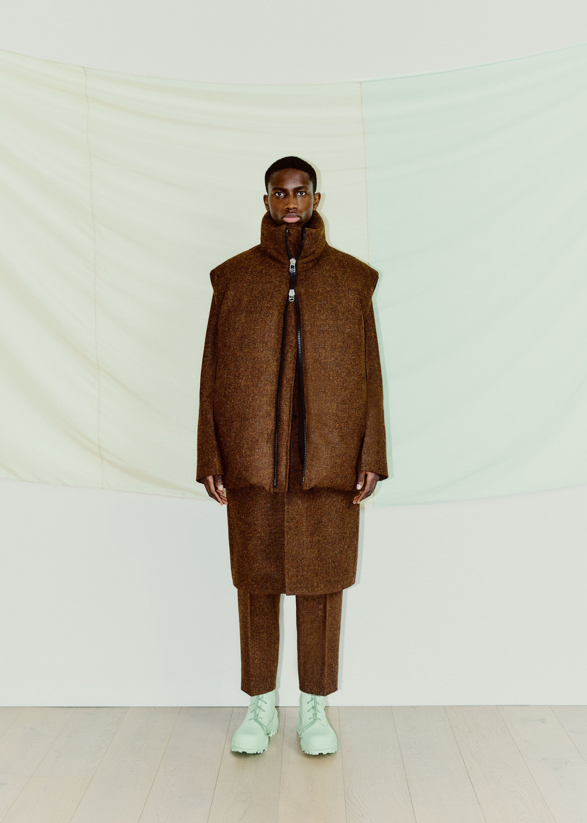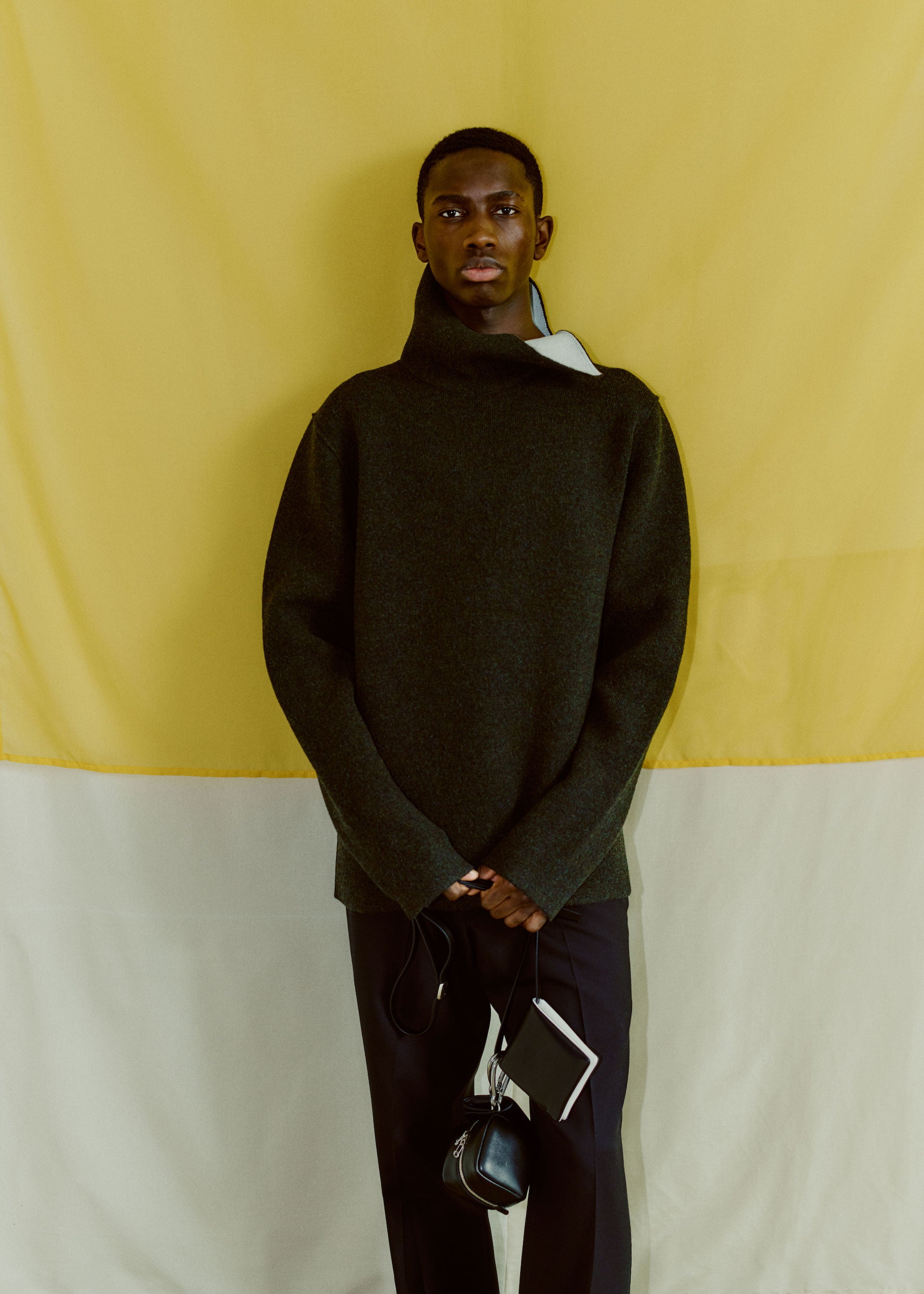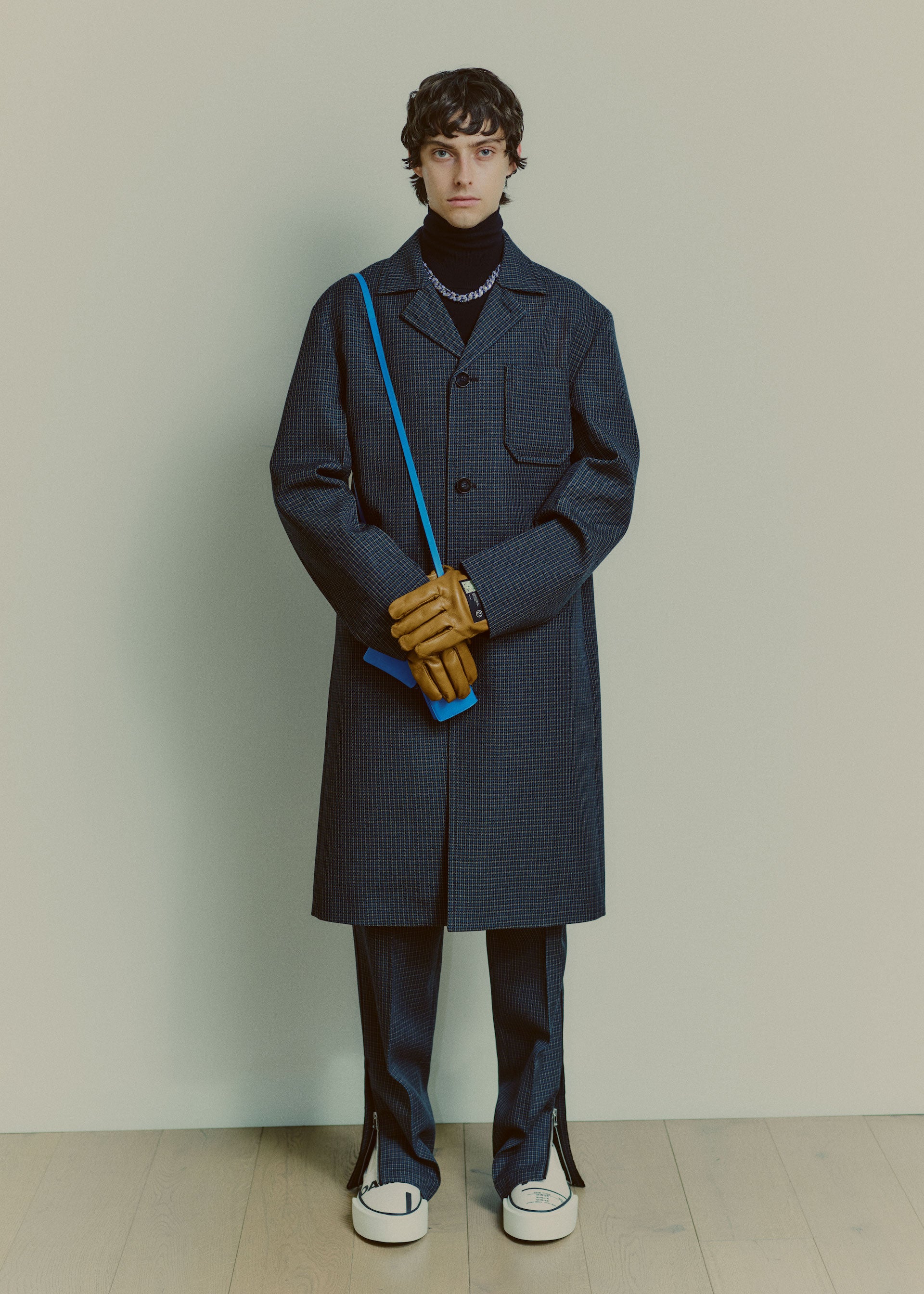 However, beyond the simple opposition of materials, the study evolved into mixing ideas and feelings, a reflection of the place and time we find ourselves in now. Elevated materials utilized in more relaxed shapes, such as track suits and cozy inflated pieces, leather jackets and trousers with elastics and coulisse adjustments, roomy jacquard wool overshirts, and double-faced shetland and viscose/nylon flared collar knits. Garments that can both be worn during long stints at home, or in transit (when possible). The underlying feeling being one that reflects an attitude that even if we are required to remain in place, we still appreciate and desire well made, beautiful things.