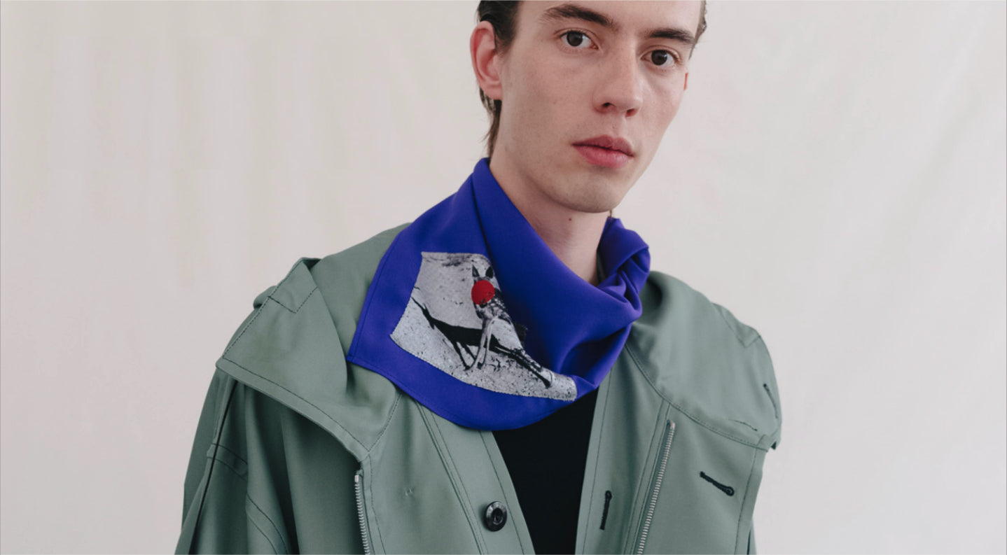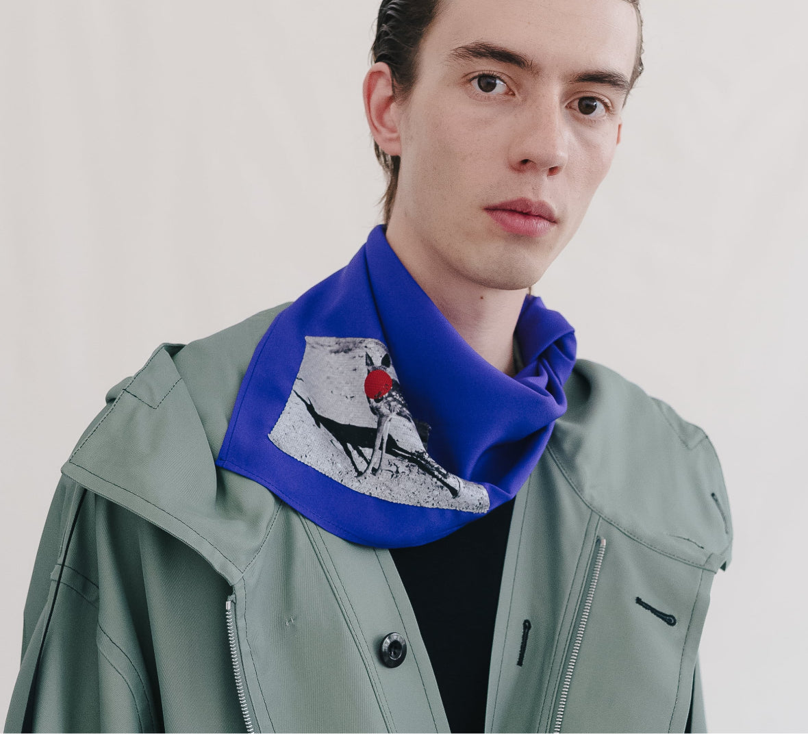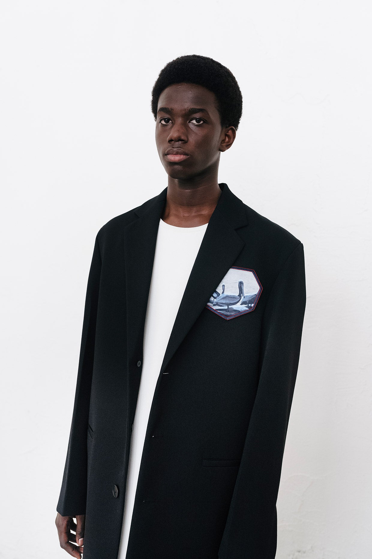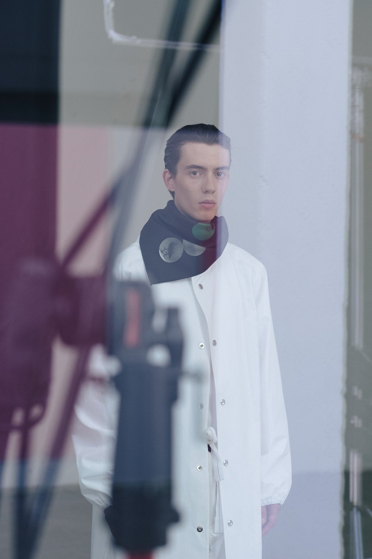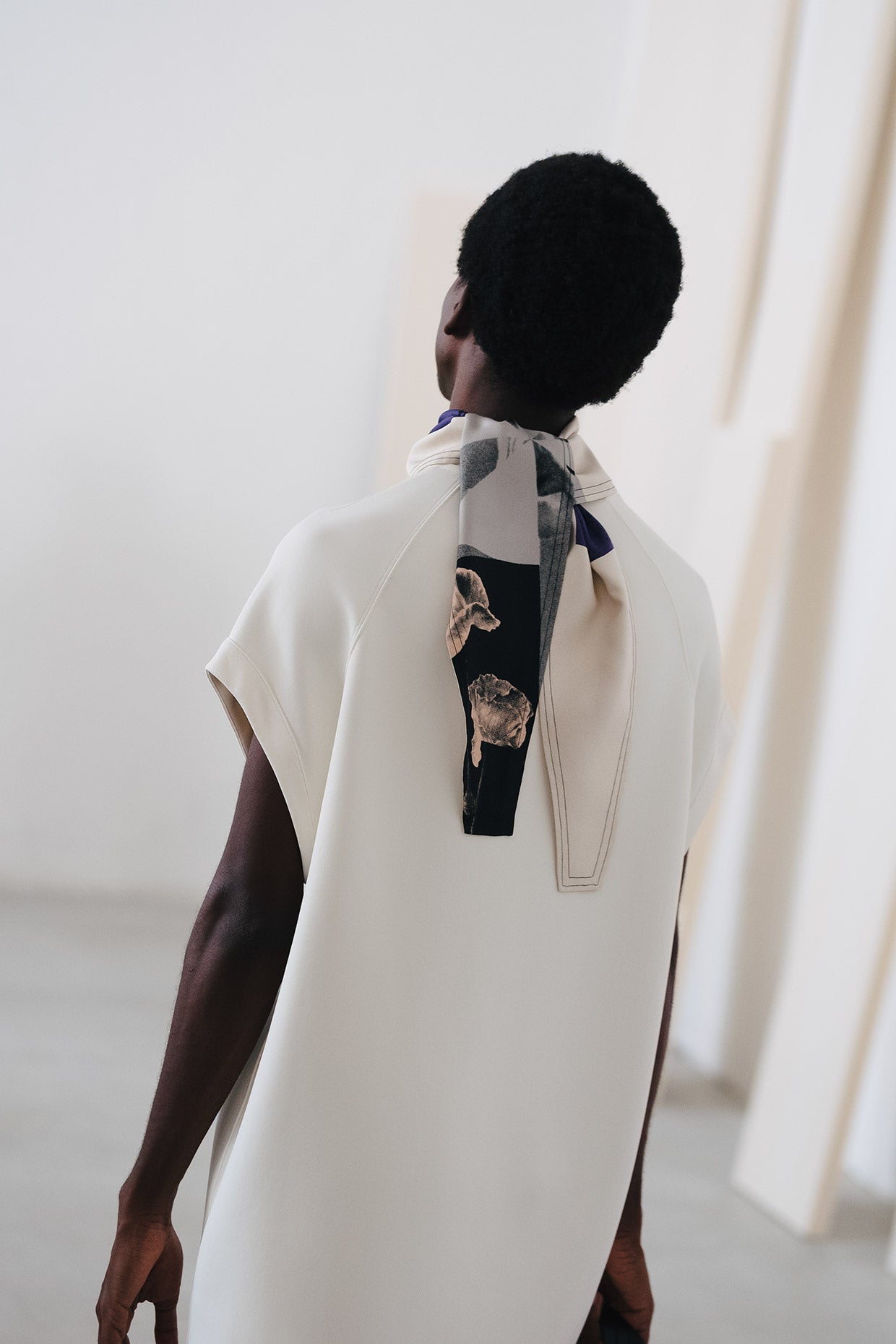 しかし、コレクションとムード、そして環境が展開するにつれ、バランスをとることが大切となった。軽やかさ、希望、ポジティブさの感覚を作り出すことが。より柔らかくとろみのある布地を取り入れ、コート、シャツやトラウザーズへと裁断された。フォルムに趣のある長めのスカーフが優雅さと洗練性を加える。