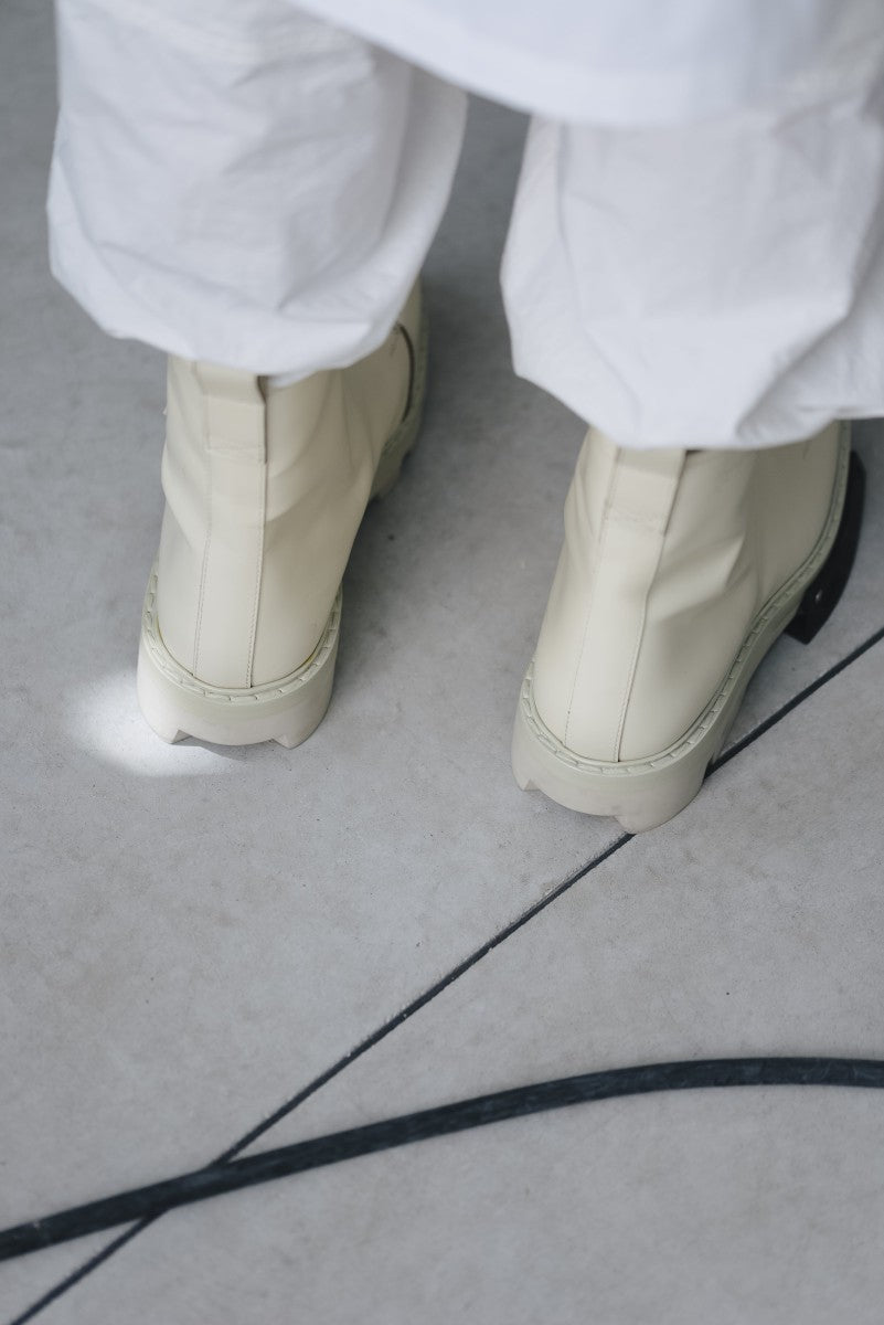 シューズやブーツはミリタリー調で、取り外し可能なラバー製インサートを取り入れた、アシンメトリー仕上げのカスタムラグソールが特徴。色味とともに、2つめのトレッドパターンを加えている。カスタム仕上げのFree Solo スニーカーのアウトソールを、新しくすっきりとしたforumで利用し、バルカナイズド仕上げのフォルムも忘れられていない。バッグは幾何学的で、機能性を重んじるユーティリタリアンの言語を思わせる。すっきりとした革製のクロスボディトランジットバッグ、オーバーサイズのキャンバス製オートバッグ、そしてナイロンを膨らませた質感に趣きのあるソフトメッセンジャーバッグのすべてに手作業で彩色・仕上げを施したトリミングをあしらい、オリジナルハードウェアで完成させている。スターリングシルバーのキノコ型ペンダントトップ付きのネックレスが、逞しさ、継続性と希望を象徴する。
