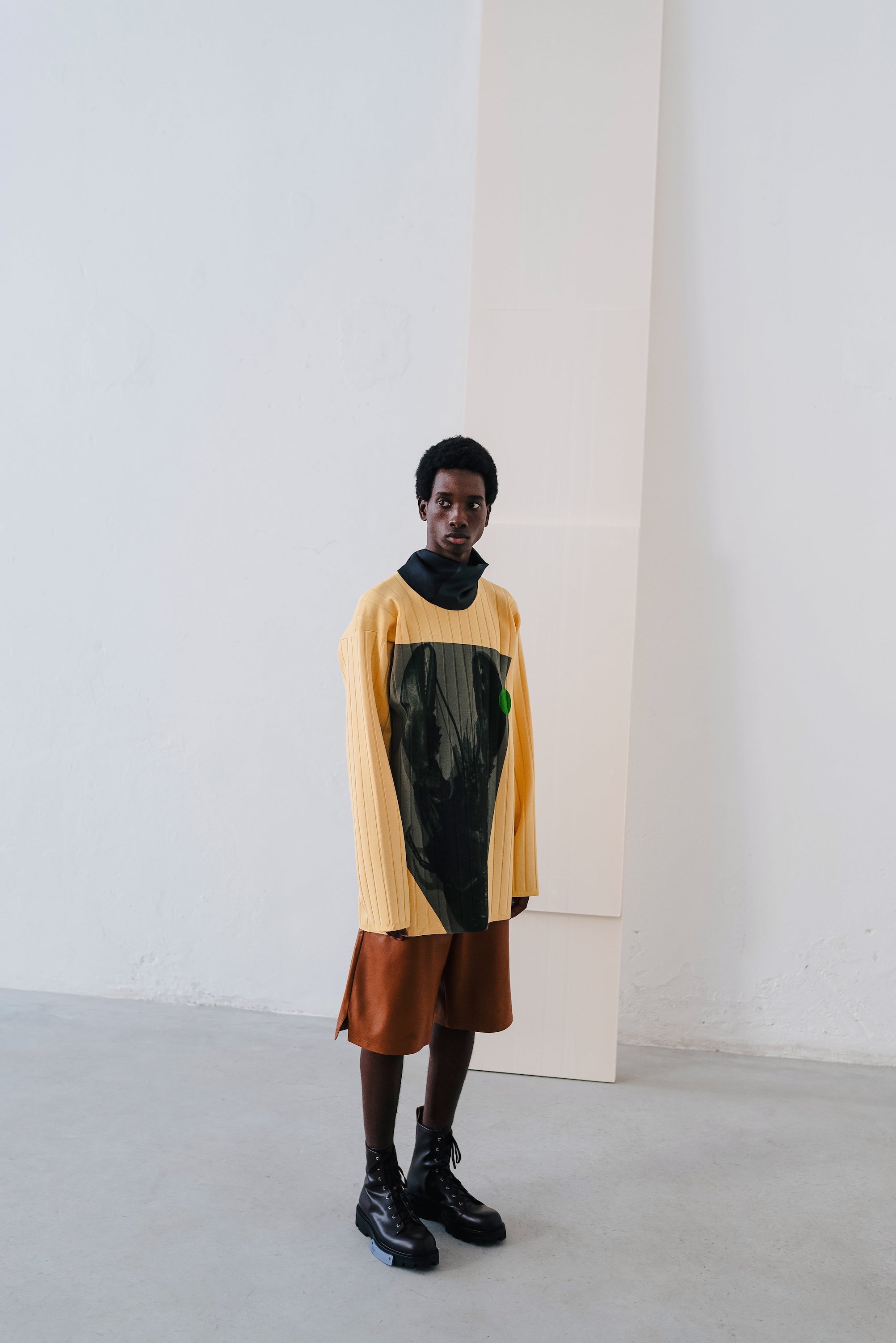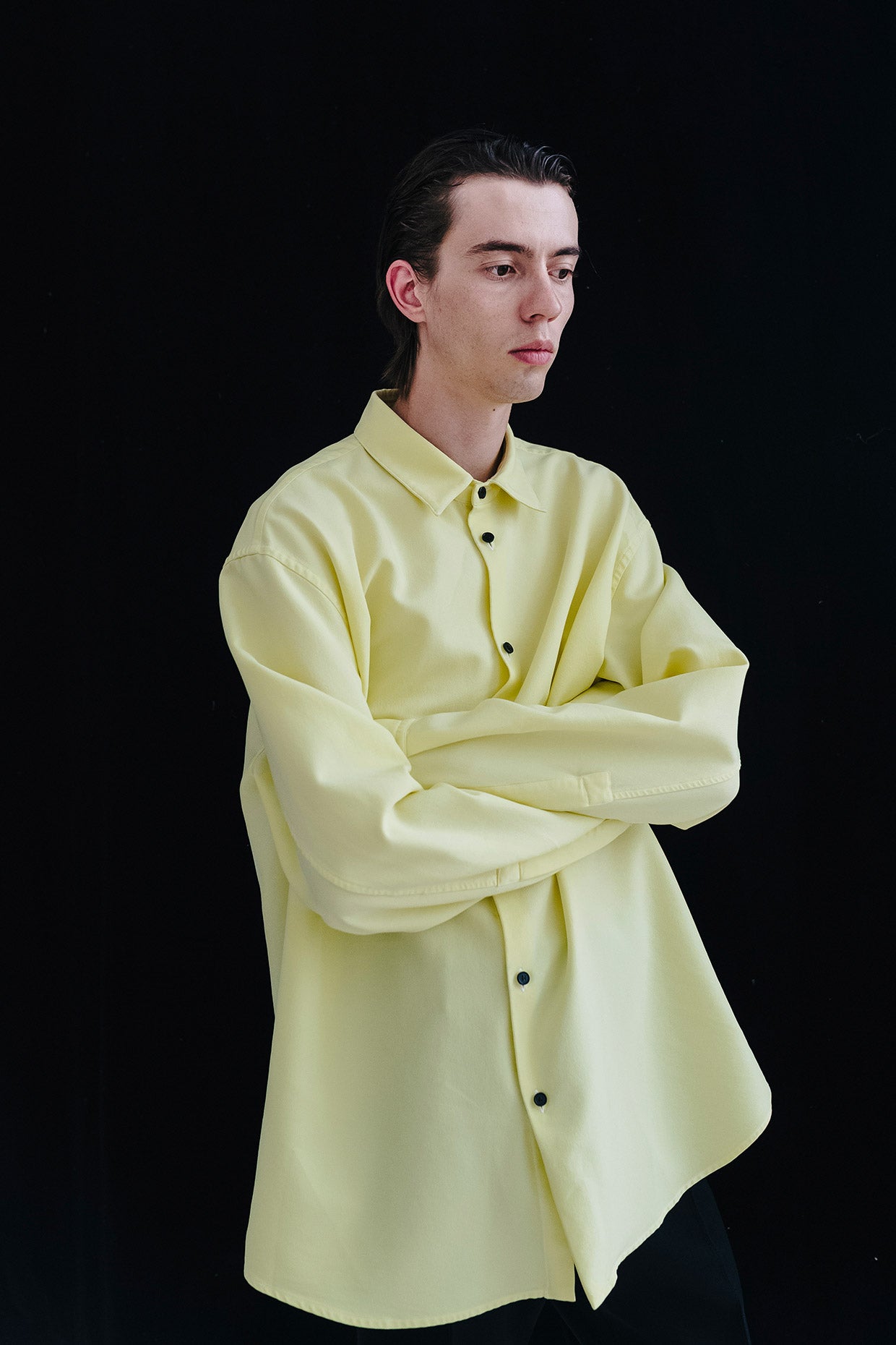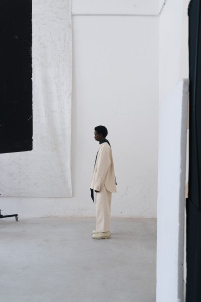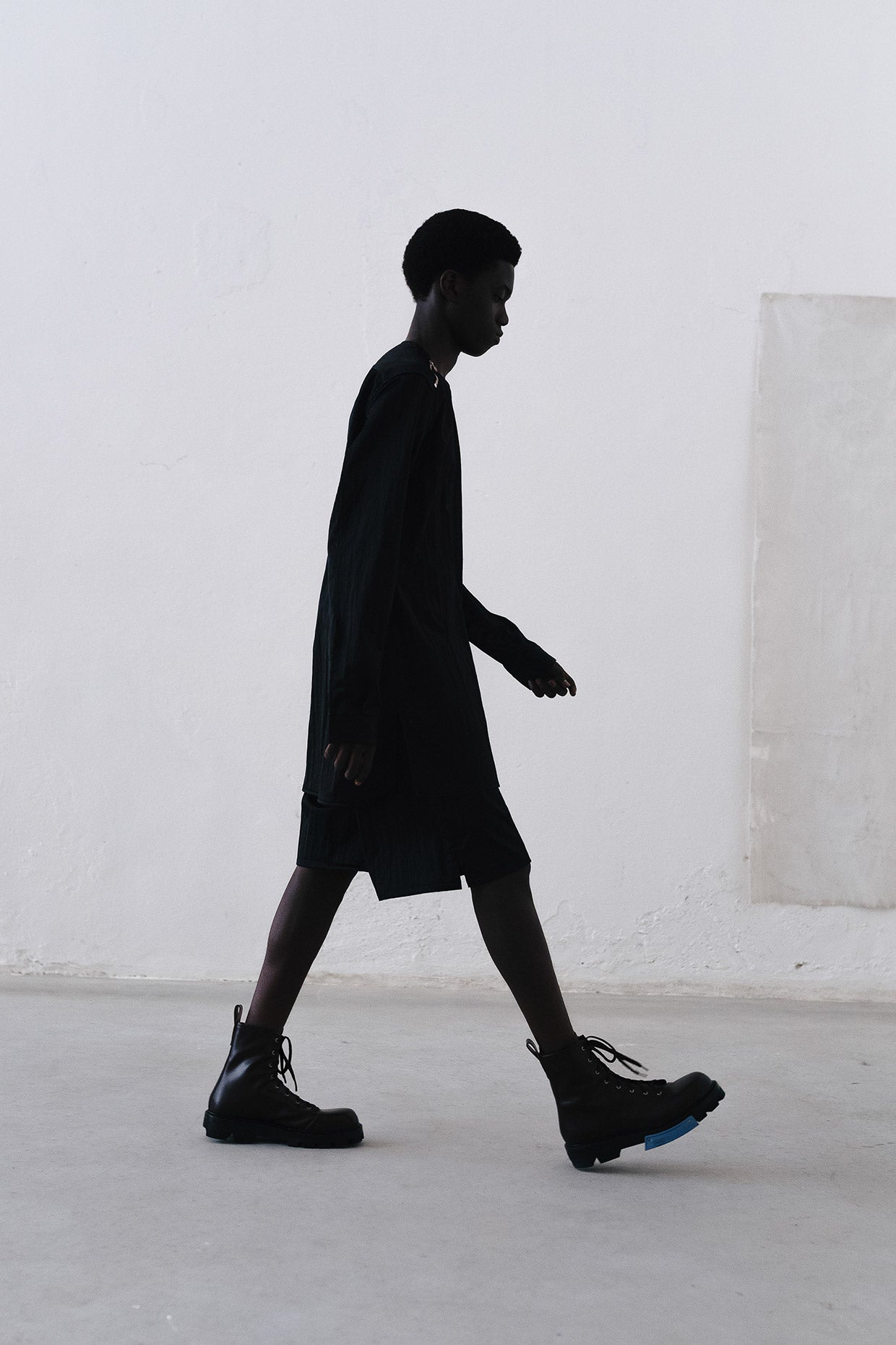 当初、このコレクションのフィーリングは力であった。ミリタリー調のフォルムと、がっしりとした布地で仕立てたピュアでかっちりとしたテーラリング。日本産のウールギャバジンカバーと、シャリ感のあるローコットンキャンバスで、力強く幾何学的な形状を可能にしていく。袖のないトップコートをスリムなテーラードパンツやショートパンツに組み合わせ、パーカをブーツにタックインしたふくらみのあるトラウザーズにプラス。現実的で誠実な素材の感覚が大切であったのだ。ピュアコットン、ウール、シルク、ビスコースのすべてをブレンドしない形で。力と守りのアイディアは、春が深まるにともない、適切な方向だと思われていた。