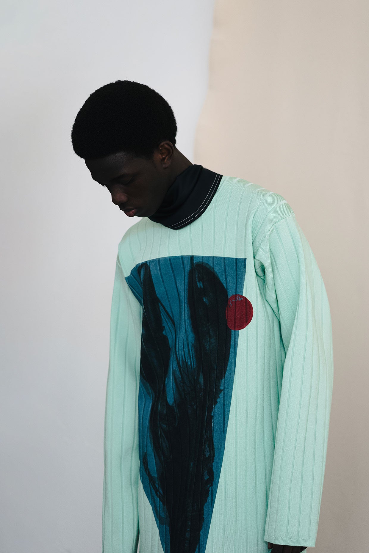 バルデッサリ氏の作品がカラーパレットのもとになっている。原色、アシッドカラー、白黒のアナログなタッチなど。鮮やかなレッド、パープル、イエロー、グリーンやブルーが、ナチュラルホワイトやオプティカルホワイト、チョコレートブラウン、タン、トープ、そしてディープオーシャンブルーを背景に、まばらに加えられている。アシッドイエローとグリーンを、白黒の写真画像とともにプリント。キャラメル色のレザーでオーガニックなタッチをプラス。