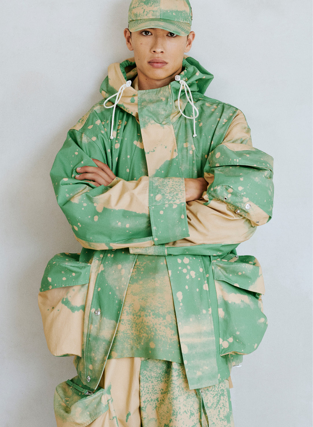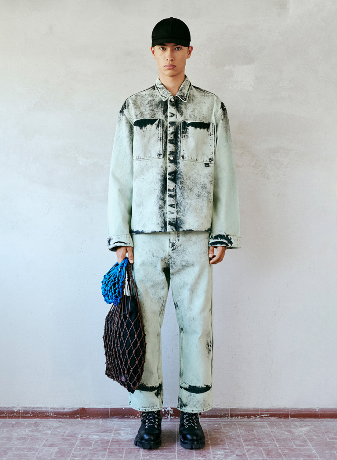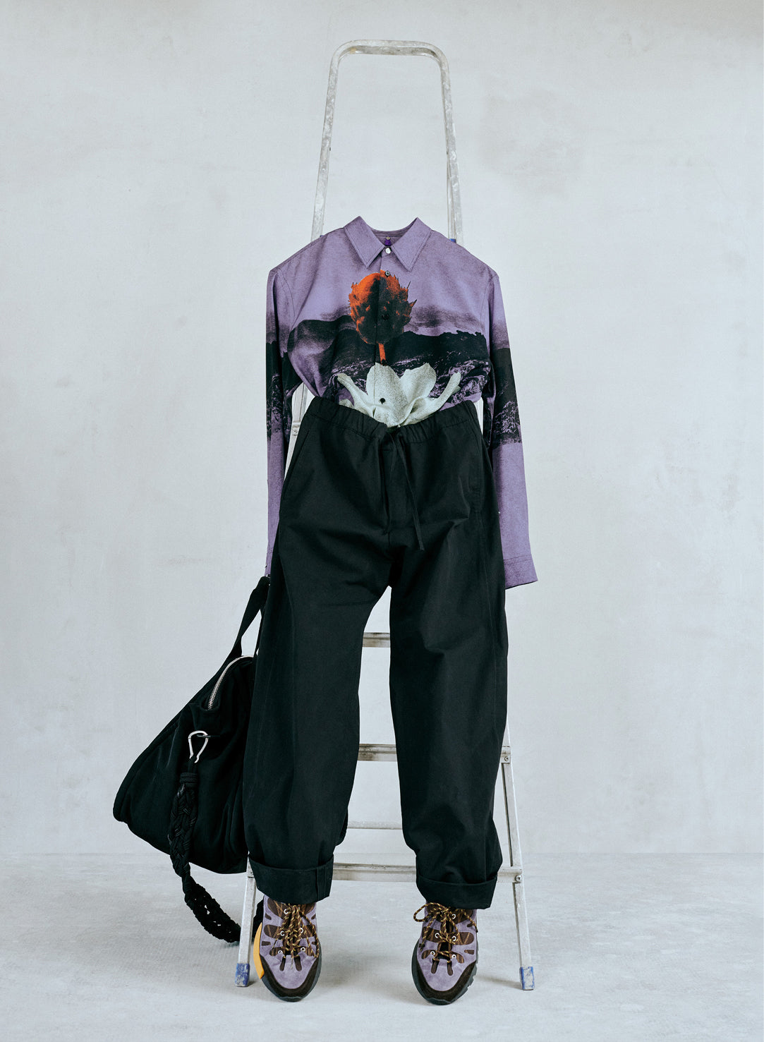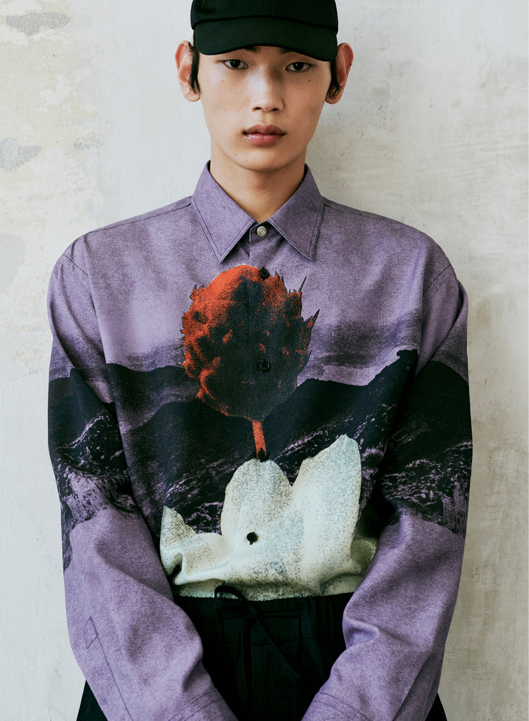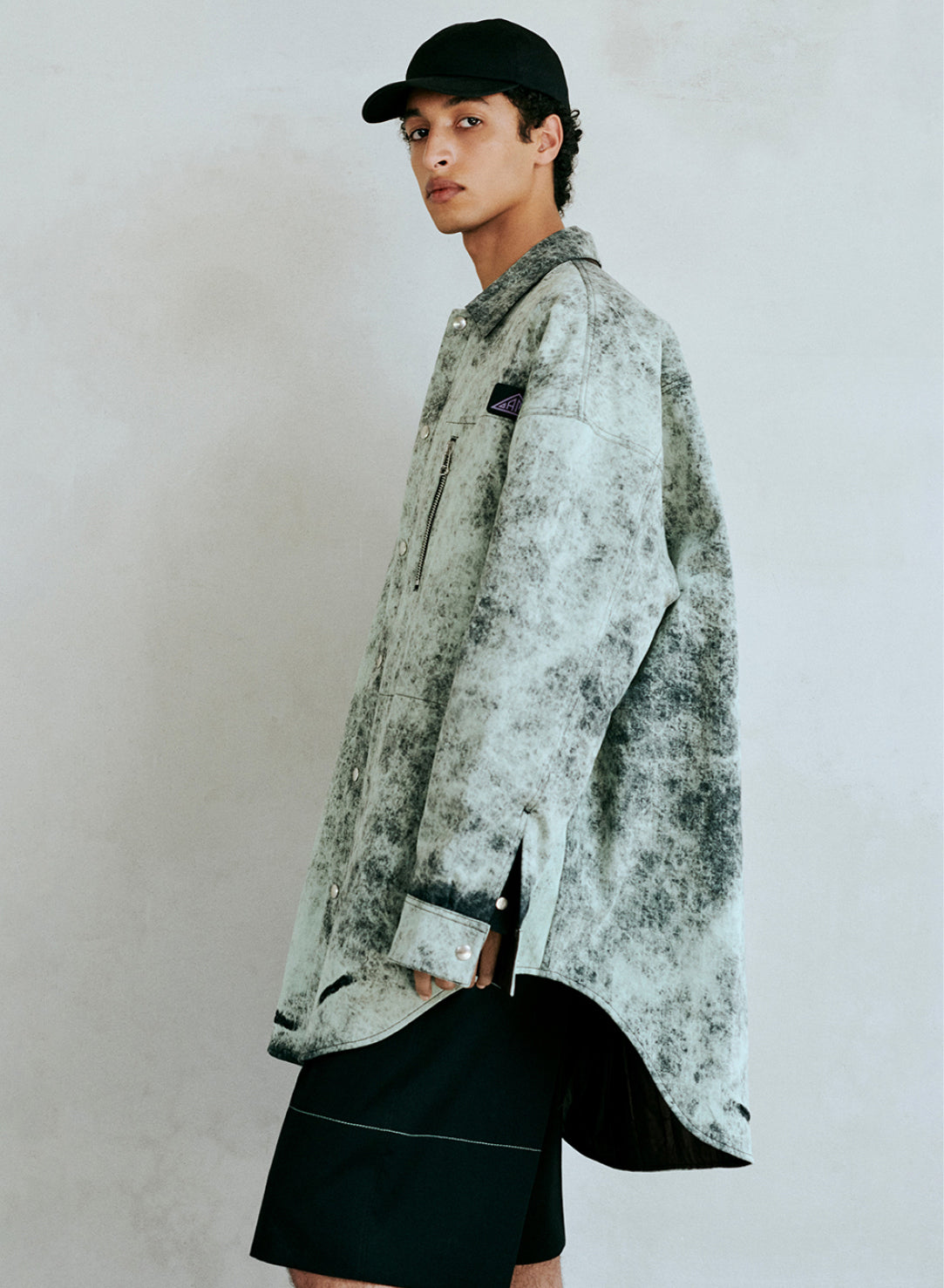 このコレクションで使用されている布地は、深く研究され、じっくり時間をかけて開発されたものです。コーティング加工を施したコットンポプリンから、無地やムリネ状の丈夫なウール地にいたるまで、技術面で大きな進歩が見られました。染色やデニムの技法にもその成果が現れています。今シーズンもまた、手作業で施されるオーバーダイや表面加工など、職人的なアプローチの奥深さが表現されました。また、とろみのあるビスコースシルクのシャツにはインパクトの大きなフローラルプリントのモチーフをあしらいました。ケミカルウォッシュのマーブル柄を思わせる、パリッとしたコットンやシルク、そして再生ナイロン布地一面にプリントを広げたウェアも登場します。色彩は鮮明なオプティカルホワイト、クリーム、エッグシェルイエローから、サンド、ベージュ、ライラック、ペールグリーンなどのナチュラルカラー、そして力強く深みのあるブラックやグレーに至るまで、幅広く扱われています。