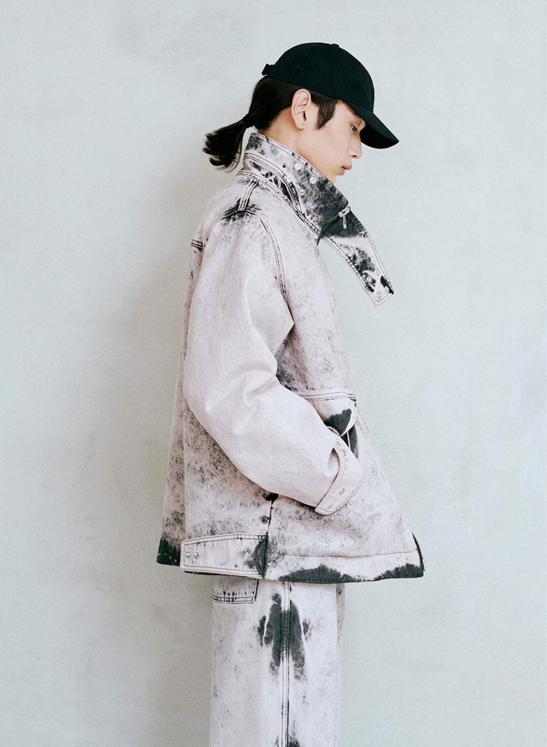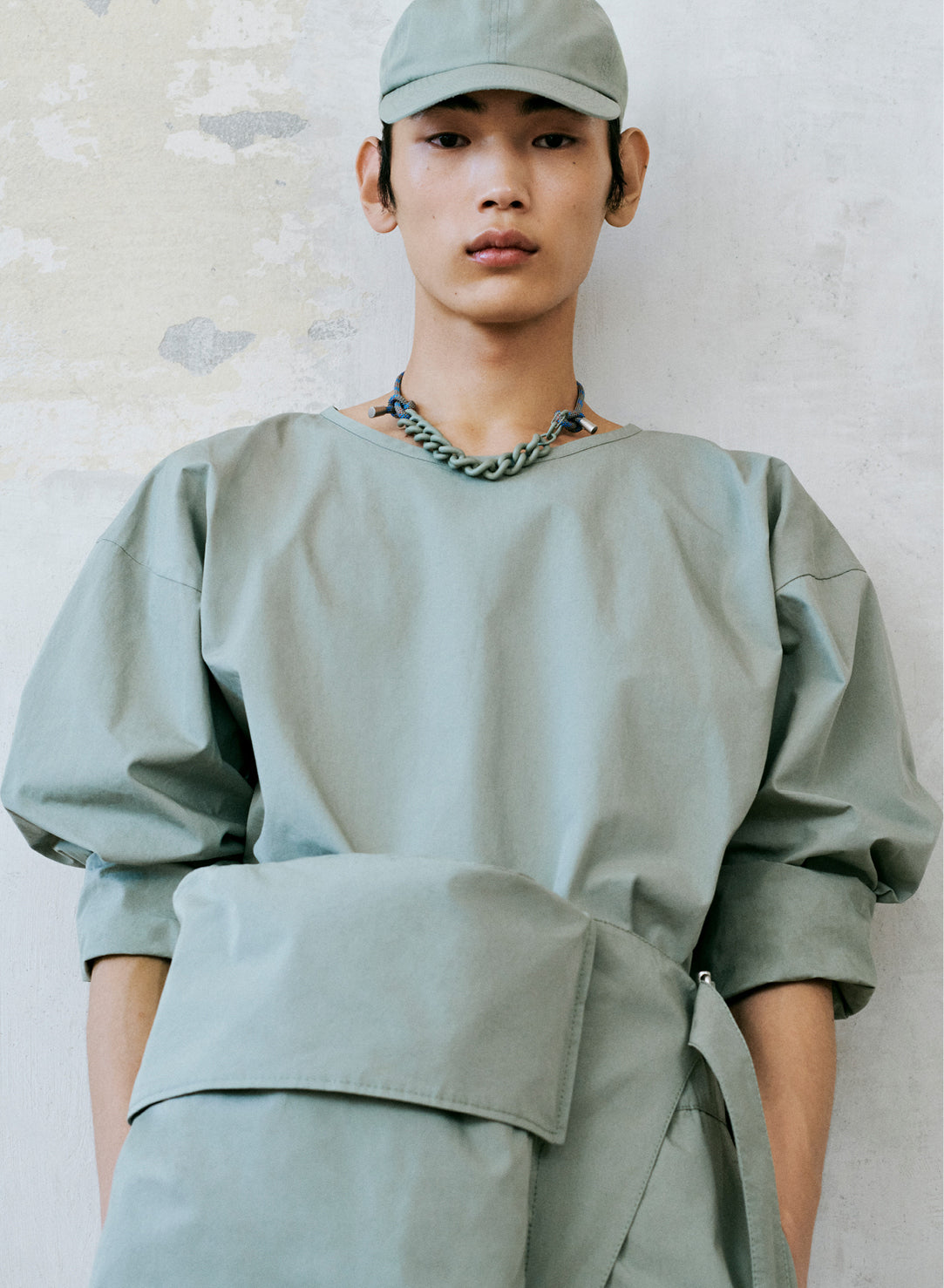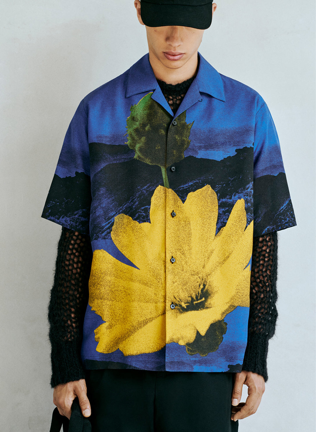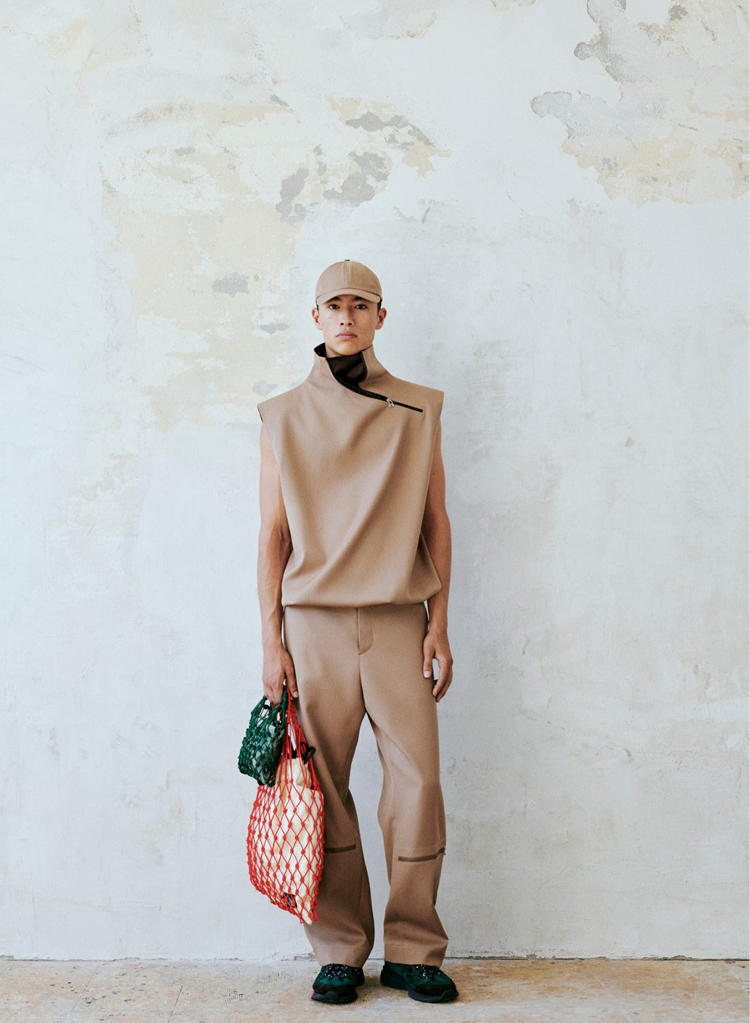 このコレクションで使用されている布地は、深く研究され、じっくり時間をかけて開発されたものです。コーティング加工を施したコットンポプリンから、無地やムリネ状の丈夫なウール地にいたるまで、技術面で大きな進歩が見られました。染色やデニムの技法にもその成果が現れています。今シーズンもまた、手作業で施されるオーバーダイや表面加工など、職人的なアプローチの奥深さが表現されました。また、とろみのあるビスコースシルクのシャツにはインパクトの大きなフローラルプリントのモチーフをあしらいました。ケミカルウォッシュのマーブル柄を思わせる、パリッとしたコットンやシルク、そして再生ナイロン布地一面にプリントを広げたウェアも登場します。色彩は鮮明なオプティカルホワイト、クリーム、エッグシェルイエローから、サンド、ベージュ、ライラック、ペールグリーンなどのナチュラルカラー、そして力強く深みのあるブラックやグレーに至るまで、幅広く扱われています。