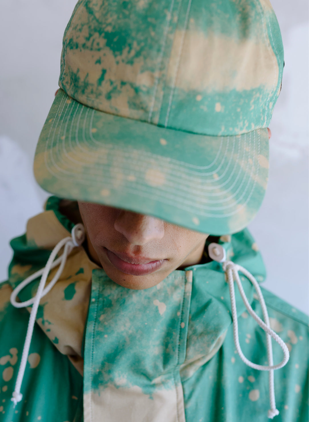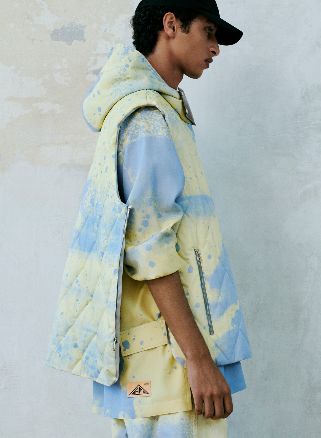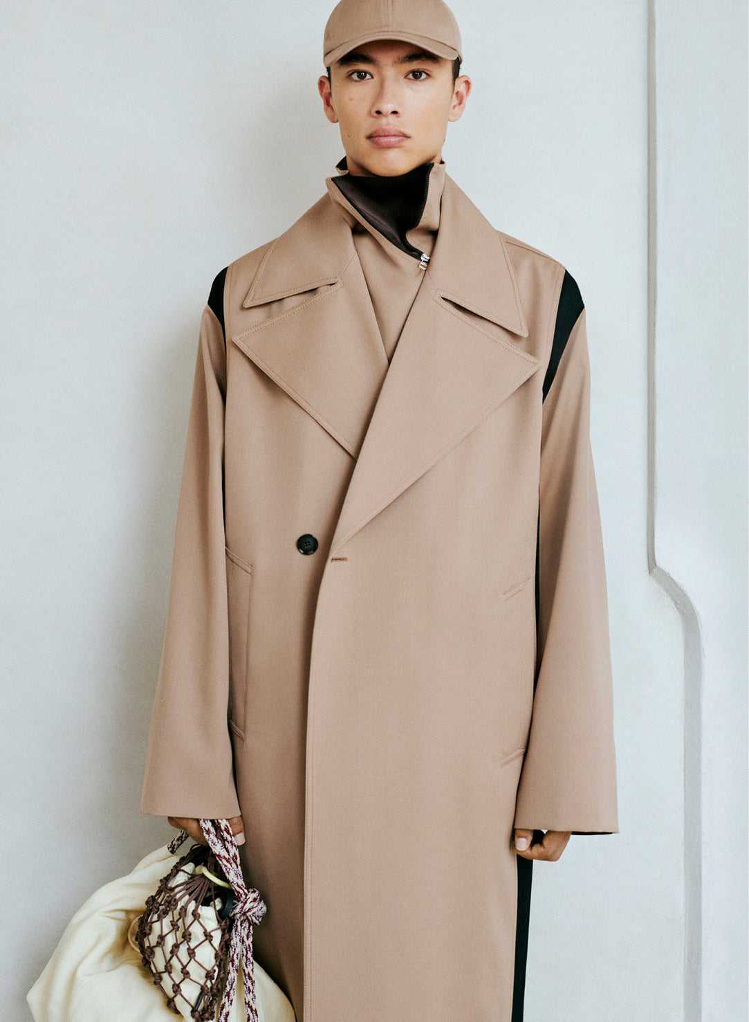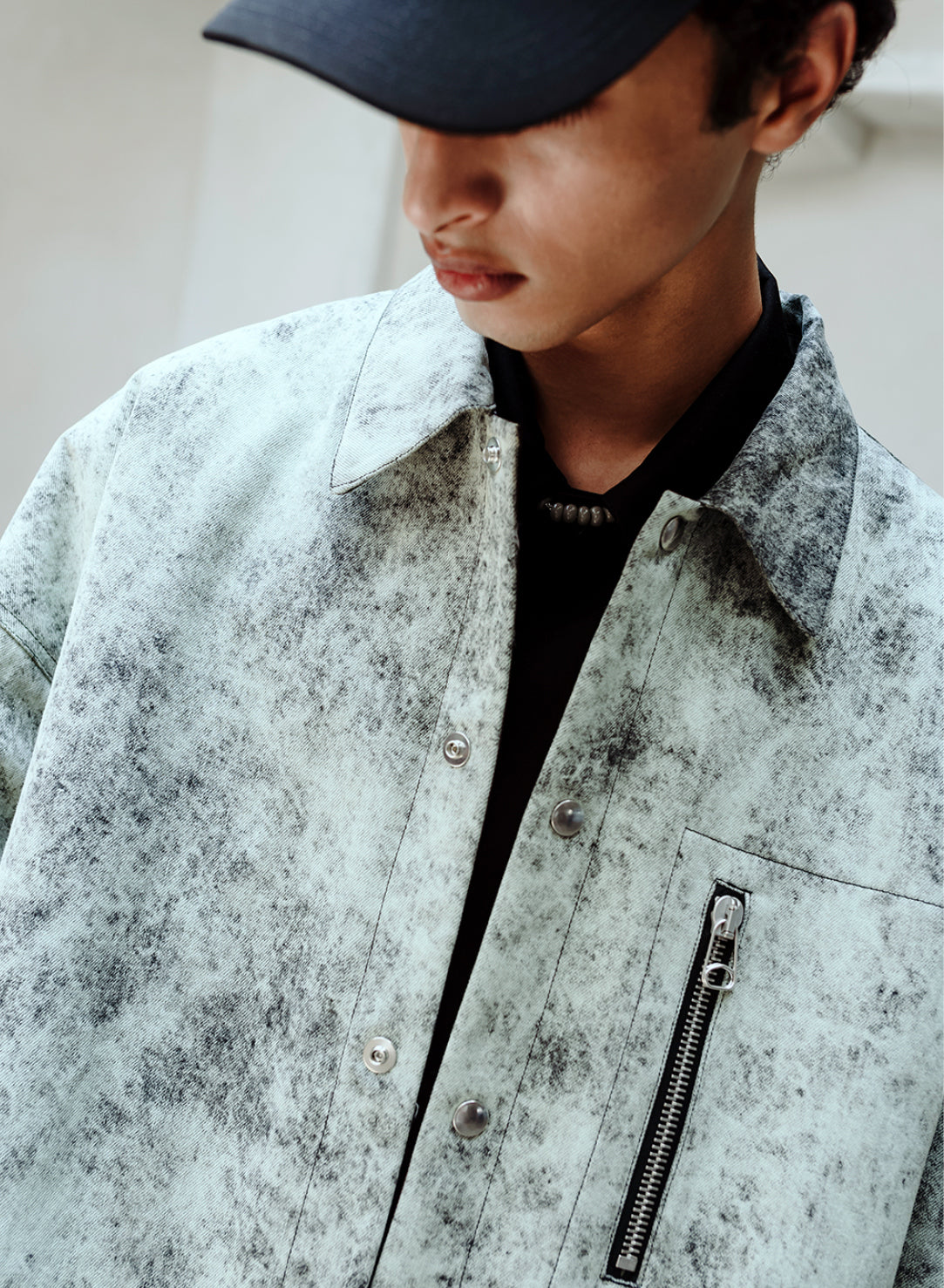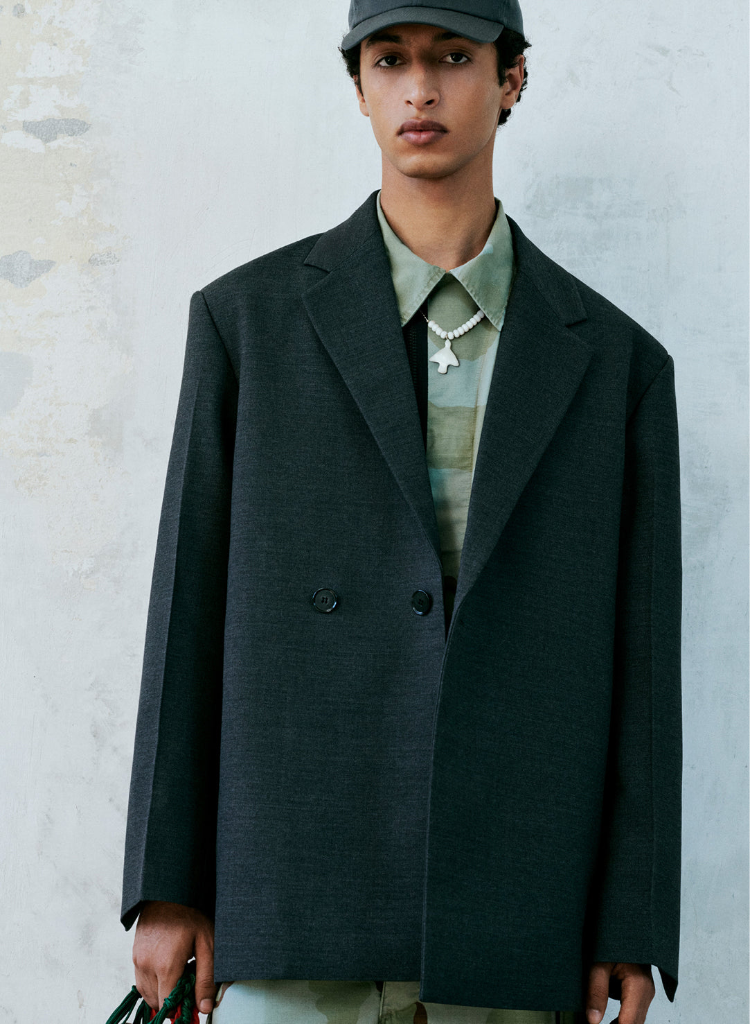 このコレクションで使用されている布地は、深く研究され、じっくり時間をかけて開発されたものです。コーティング加工を施したコットンポプリンから、無地やムリネ状の丈夫なウール地にいたるまで、技術面で大きな進歩が見られました。染色やデニムの技法にもその成果が現れています。今シーズンもまた、手作業で施されるオーバーダイや表面加工など、職人的なアプローチの奥深さが表現されました。また、とろみのあるビスコースシルクのシャツにはインパクトの大きなフローラルプリントのモチーフをあしらいました。ケミカルウォッシュのマーブル柄を思わせる、パリッとしたコットンやシルク、そして再生ナイロン布地一面にプリントを広げたウェアも登場します。色彩は鮮明なオプティカルホワイト、クリーム、エッグシェルイエローから、サンド、ベージュ、ライラック、ペールグリーンなどのナチュラルカラー、そして力強く深みのあるブラックやグレーに至るまで、幅広く扱われています。