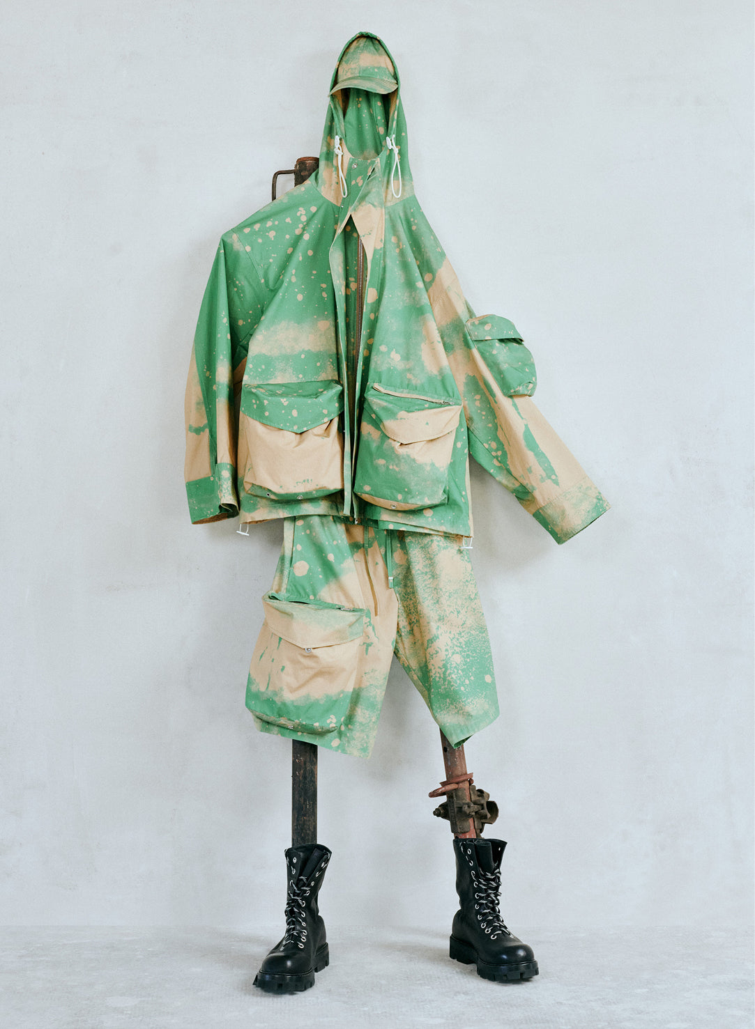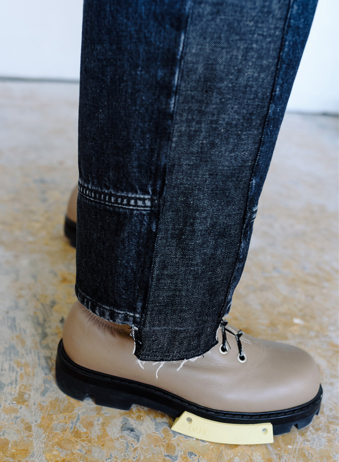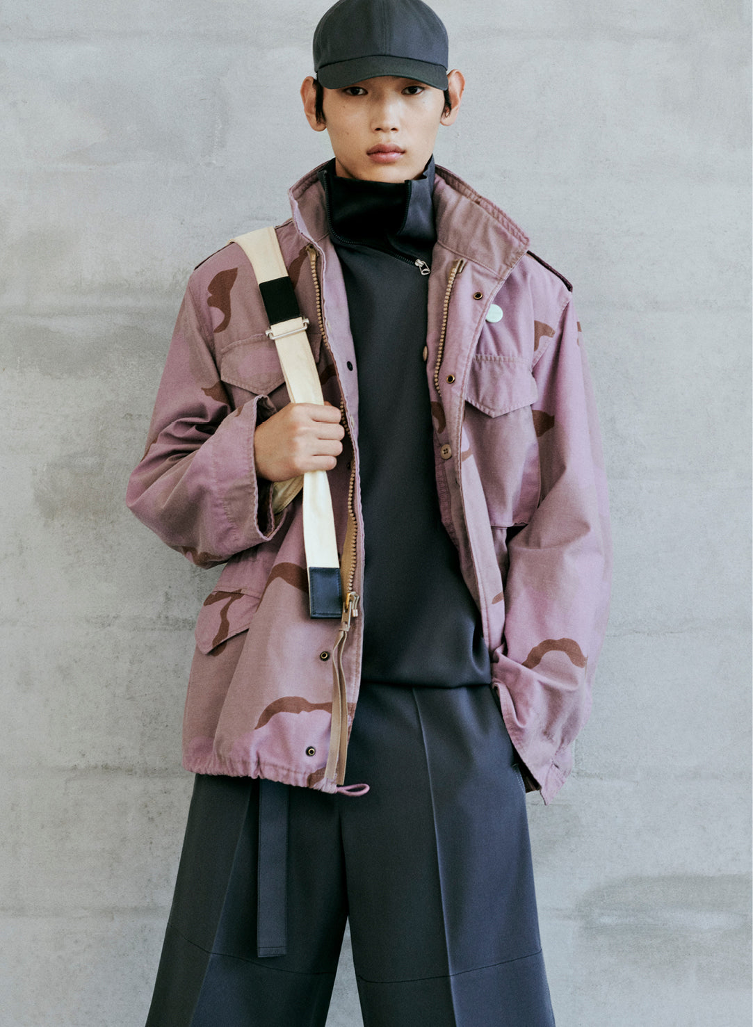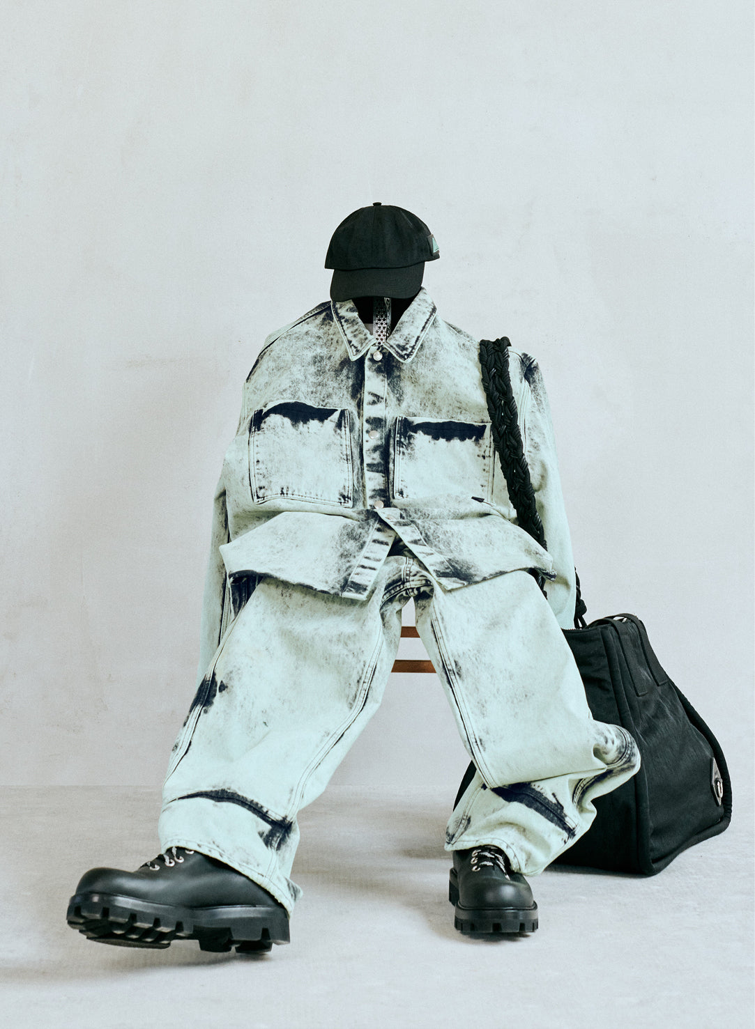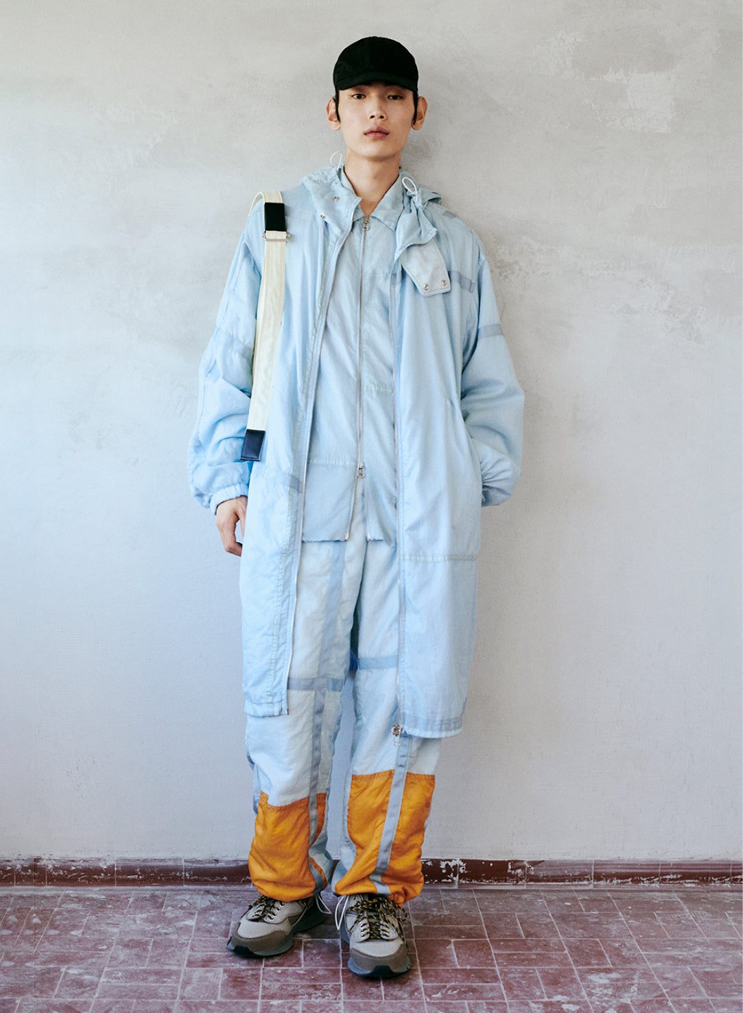 しかし、今シーズン最も重要なのは、OAMC Re:Workの導入です。私たちは、既存の衣服、布地、トリムにオーバーダイ・補強を施してプロポーションを再構築し、金具遣いや布パネルを合せて改造するというアイデアに、コレクションの一部をあてがいました。今シーズンは、ミリタリーウェアやブランケットを解体し、特にアメリカのM-65フィールドジャケットライナーを完全に作り変えて、いくつかのモデルを作り出す行為に重点を置いています。