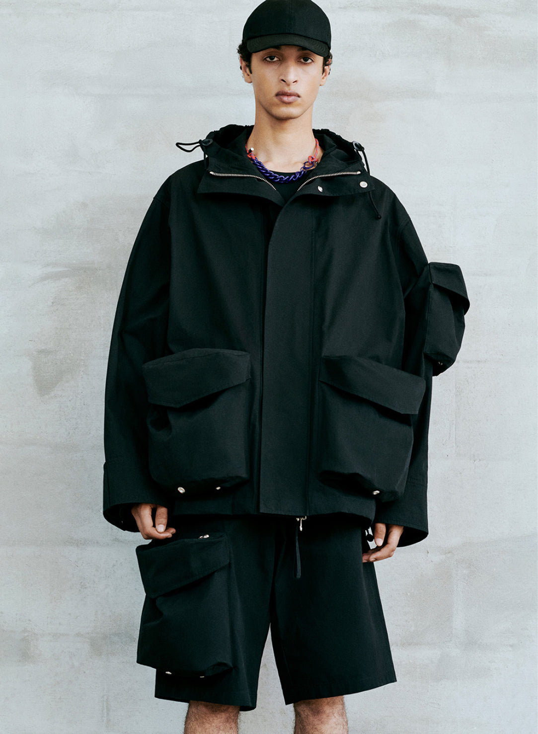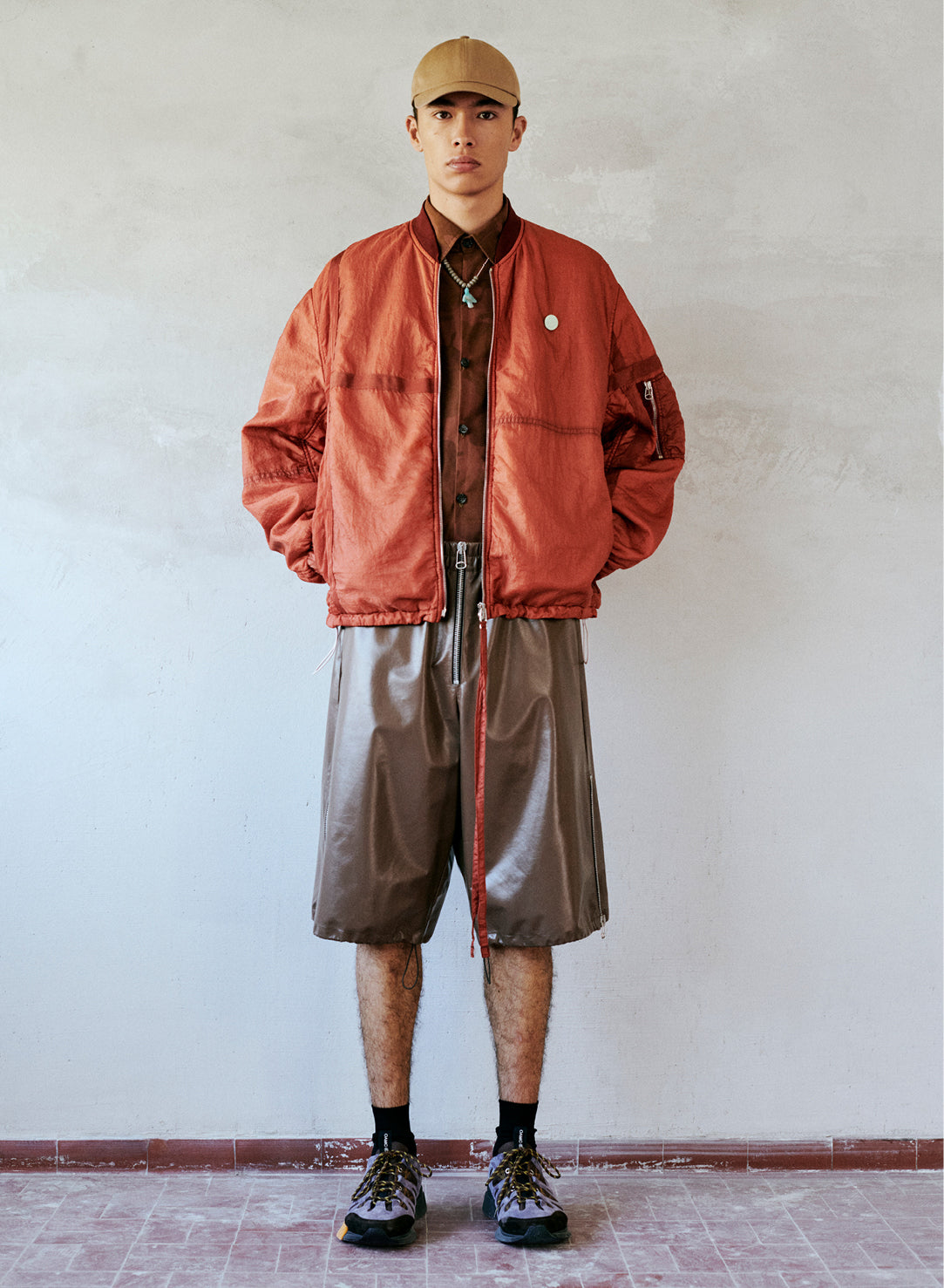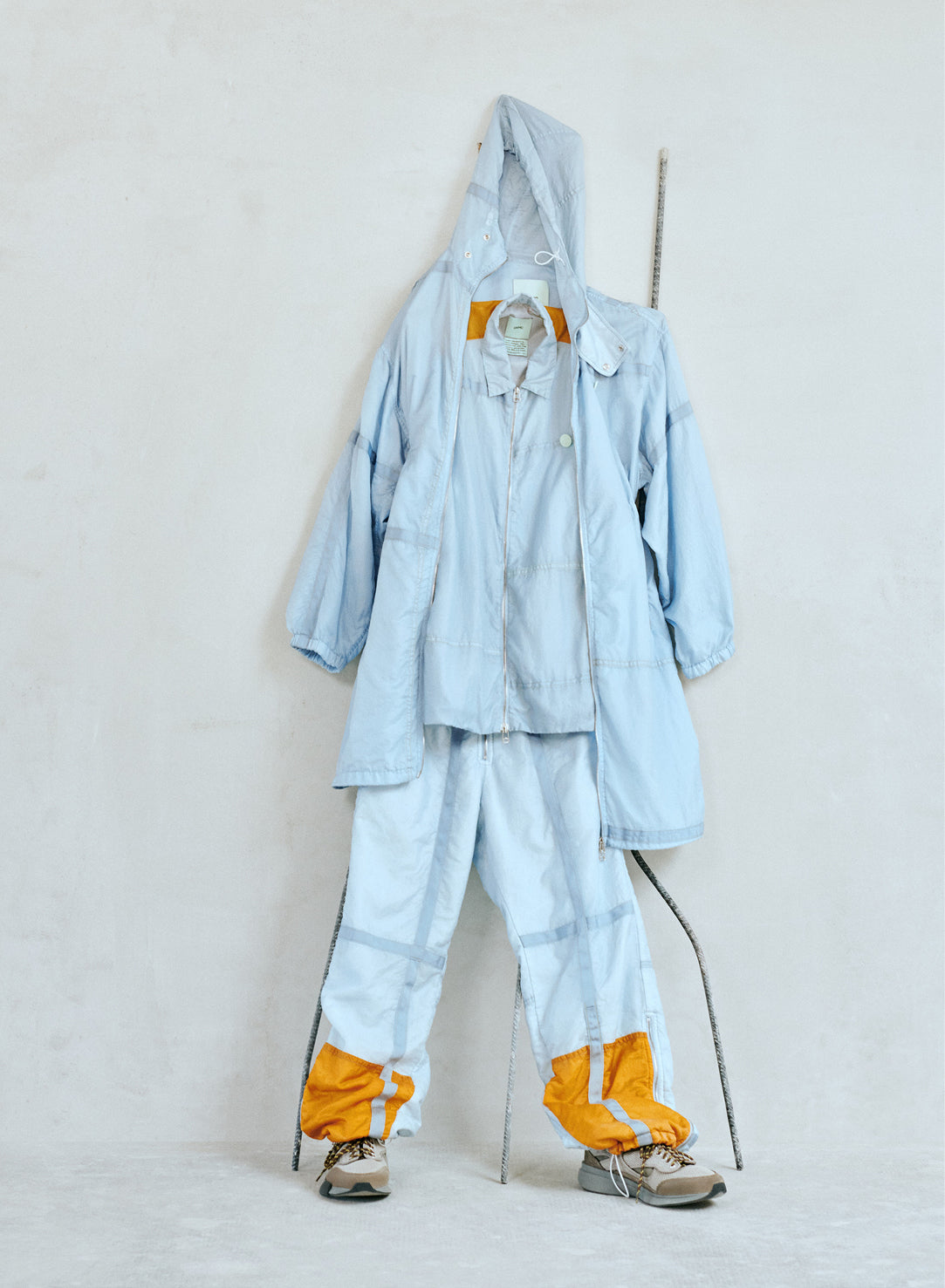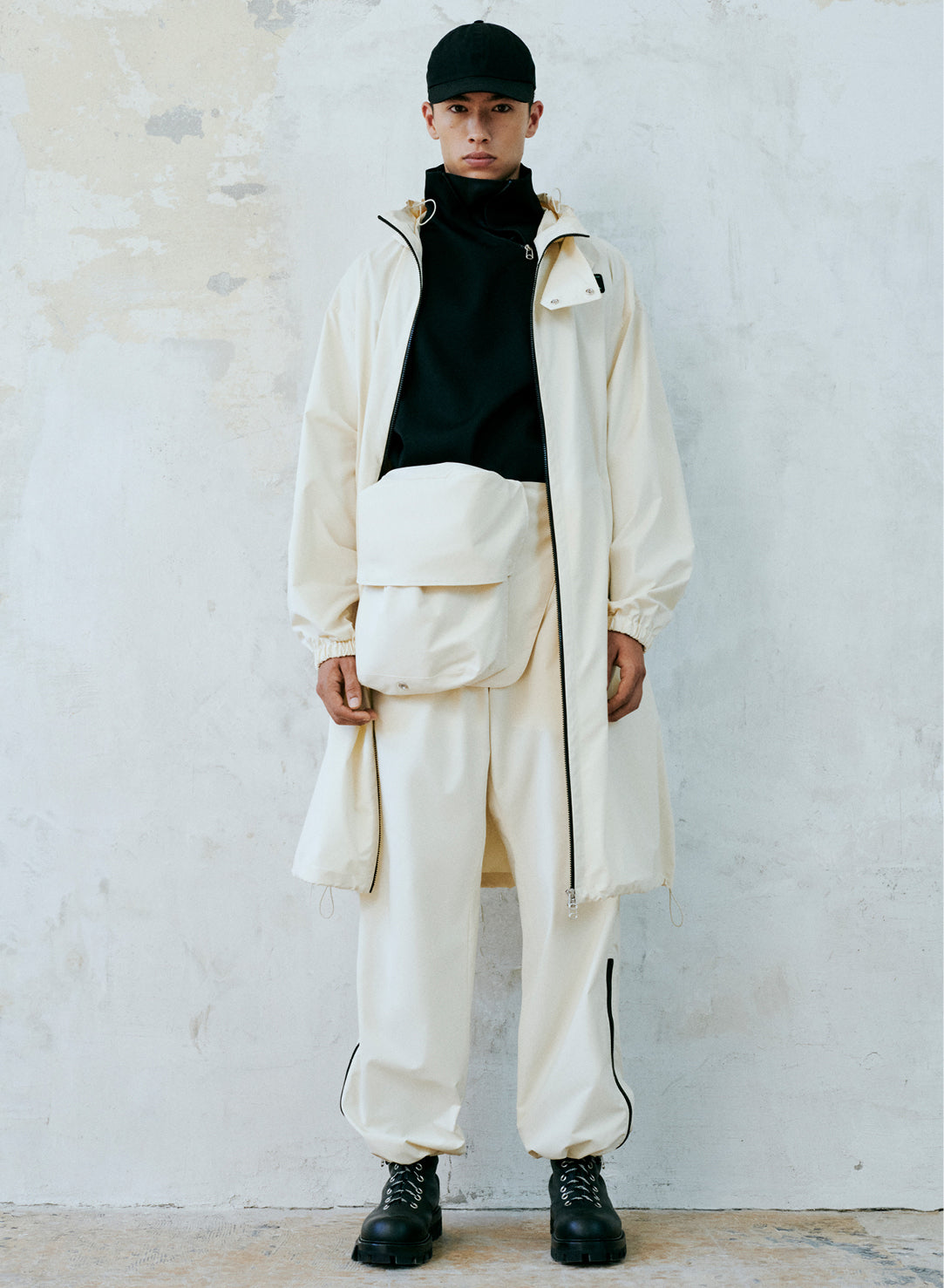 OAMCの2023年春夏コレクションの出発点となったのは、機能性に優れたアルペンウェアの形状を研究すること。山や海辺など、アウトドアで長時間過ごすと、自然の景観に備わる幾何学性と美しさが、このような場所の探検に役立つ機能的なウェアやアクセサリー、フットウェアと対照的に類似していることが明らかになります。ボリューム感のある立体的なポケット、シャープでクリーンなシャツや、襟もとを斜めに走る1本のジッパーで区切られらたベストなど、そのフォルムは純粋で、機能性の秀逸さに疑う余地はなく、型にはまらない強烈な美的視点を提供しているのです。登山服やアルペンワードローブの原型を、モダンさかつ実用性を重んじる感性で改造しました。