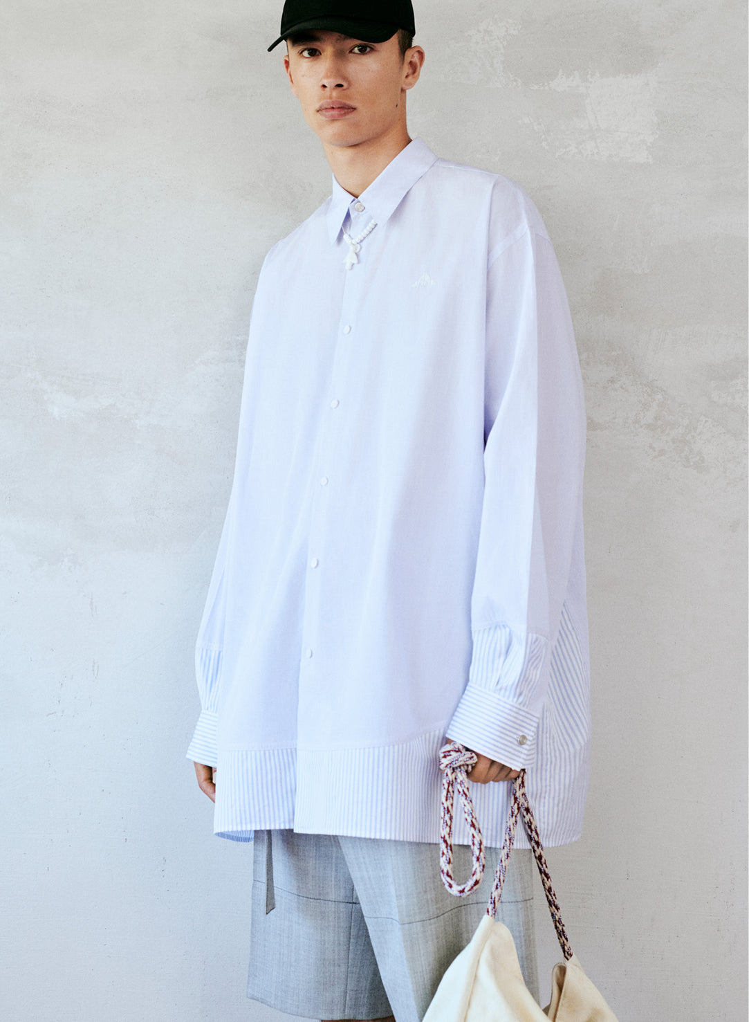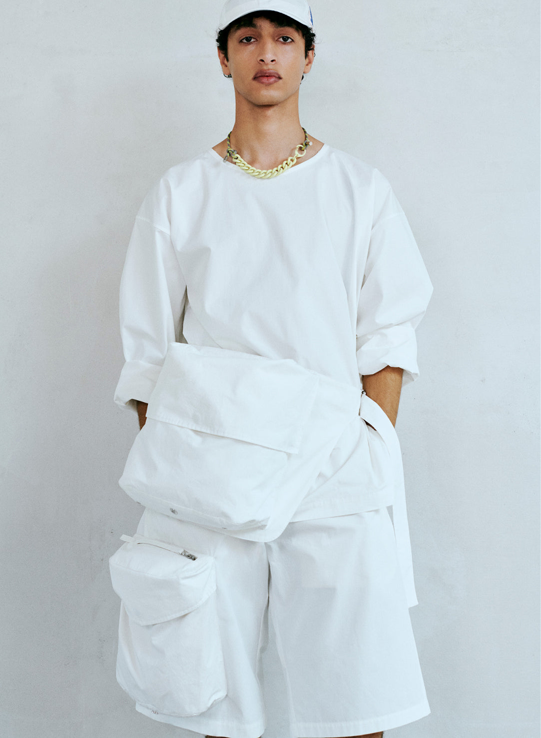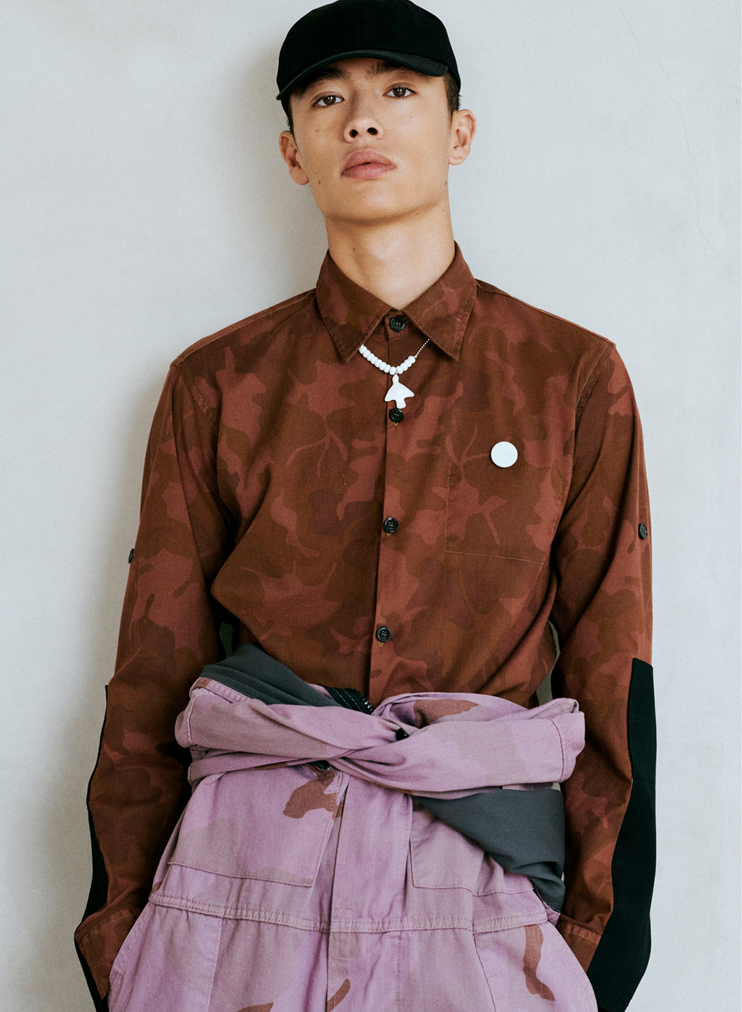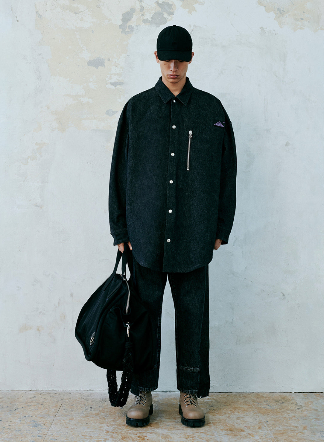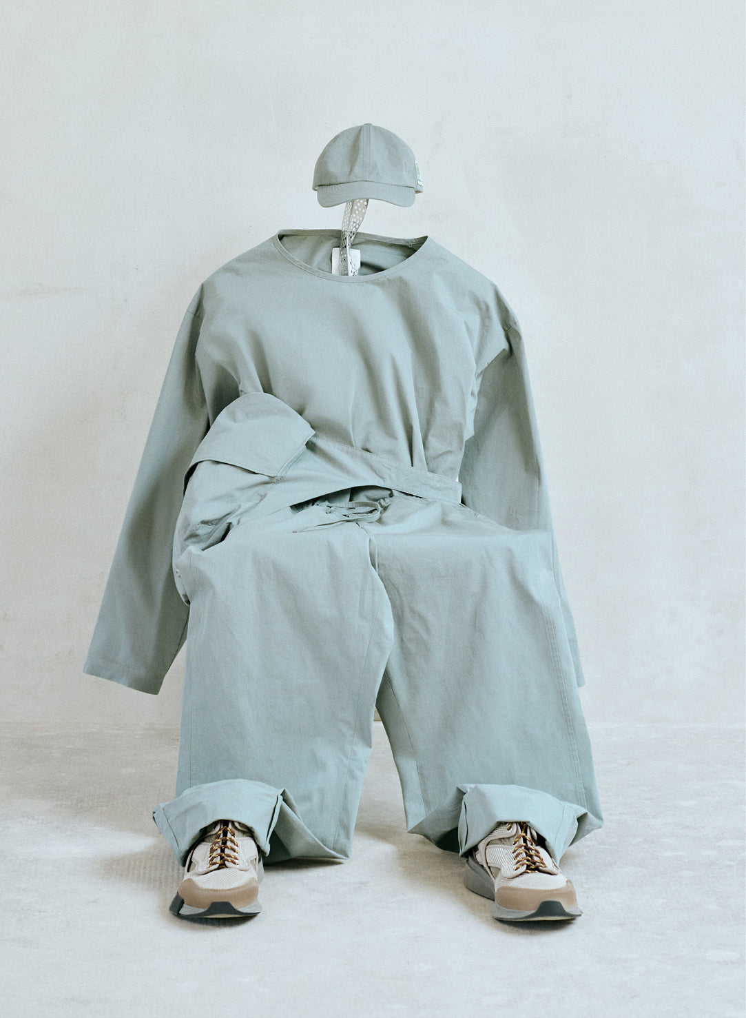 OAMCの2023年春夏コレクションの出発点となったのは、機能性に優れたアルペンウェアの形状を研究すること。山や海辺など、アウトドアで長時間過ごすと、自然の景観に備わる幾何学性と美しさが、このような場所の探検に役立つ機能的なウェアやアクセサリー、フットウェアと対照的に類似していることが明らかになります。ボリューム感のある立体的なポケット、シャープでクリーンなシャツや、襟もとを斜めに走る1本のジッパーで区切られらたベストなど、そのフォルムは純粋で、機能性の秀逸さに疑う余地はなく、型にはまらない強烈な美的視点を提供しているのです。登山服やアルペンワードローブの原型を、モダンさかつ実用性を重んじる感性で改造しました。