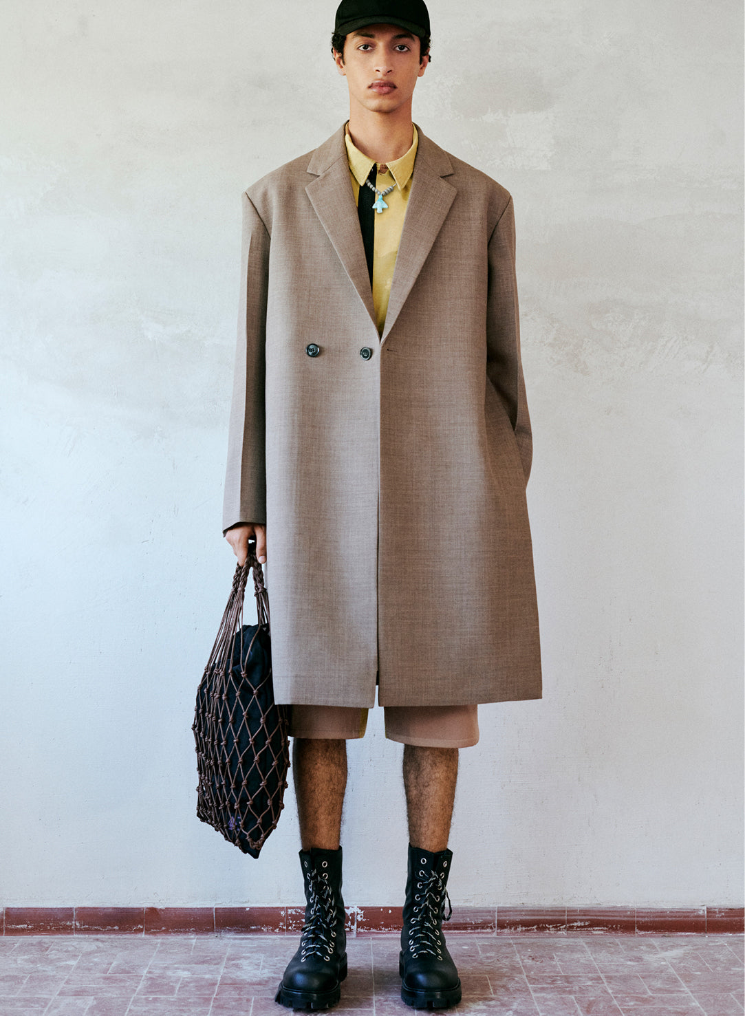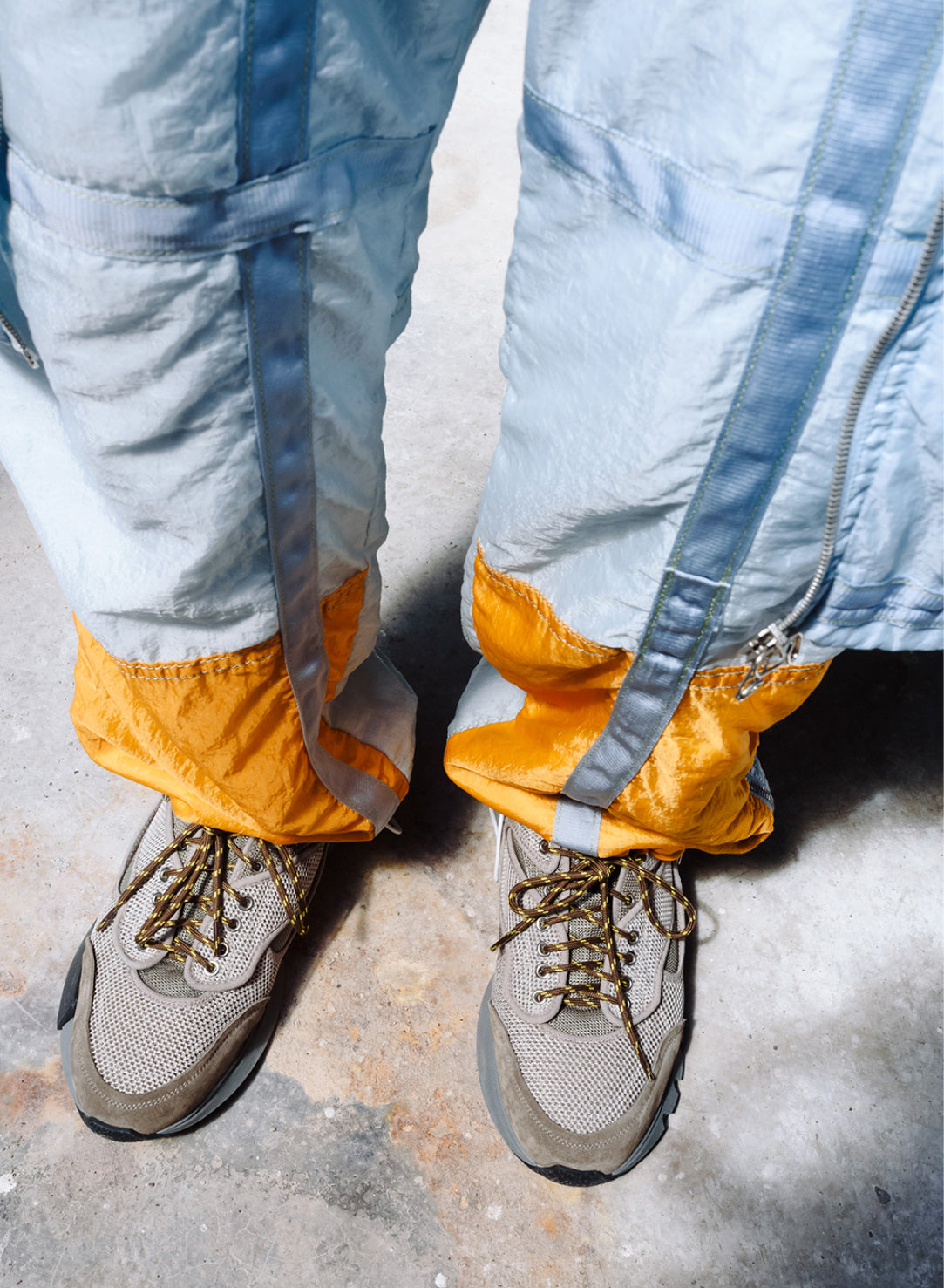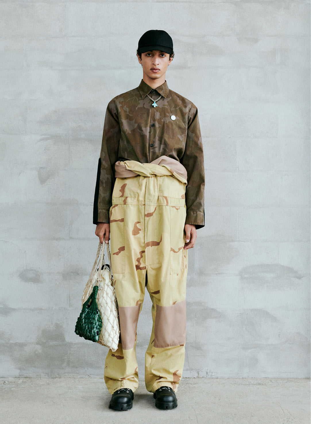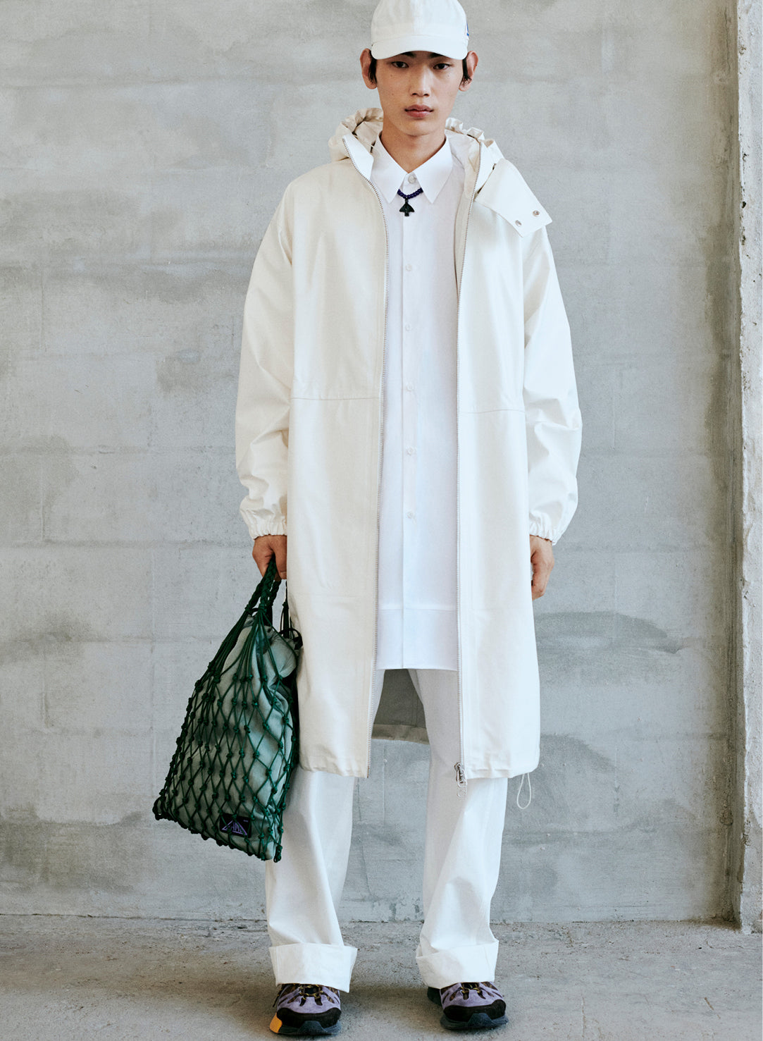 シューズやスニーカーも、アウトドア感覚を持ち合わせています。ヴィンテージ調のトレイルランニングシューズからインスピレーションを受けた素材の配合や色遣いは、自然環境に対抗する機能性と強い躍動感を想起させます。OAMC独自のアウトソールを採用した新作スニーカーは、取り外しても使用できるオーソライトインソールと、コントラストが美しい、シグネチャーのサイドグリップディテールが特徴です。ジュエリーは生命力と重厚感がポイントとなり、彫刻された鳥やビーズ製のネックレスで高山に広がる生態系の高貴さをさらに引き立てました。さらには、パウダーコーティング加工で仕上げたマットメタルのチェーンを登山用ロープに組み合わせています。アクセサリーは幾何学的なラインの、ソフトで立体的なバッグが特徴的。ベルトとしても、肩にかけても、シンプルに手持ちにしても楽しめます。手作業で編み上げたネットバッグも、鮮やかなカラーで展開しています。