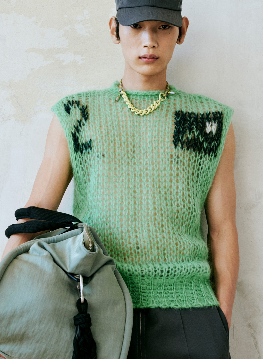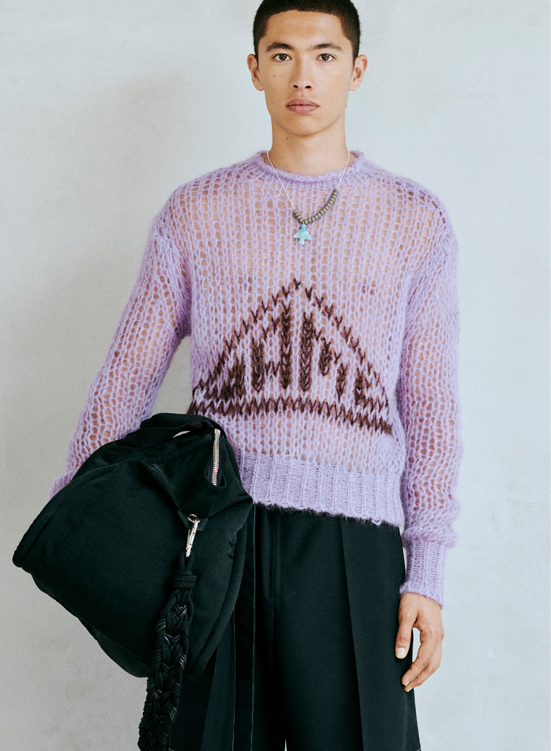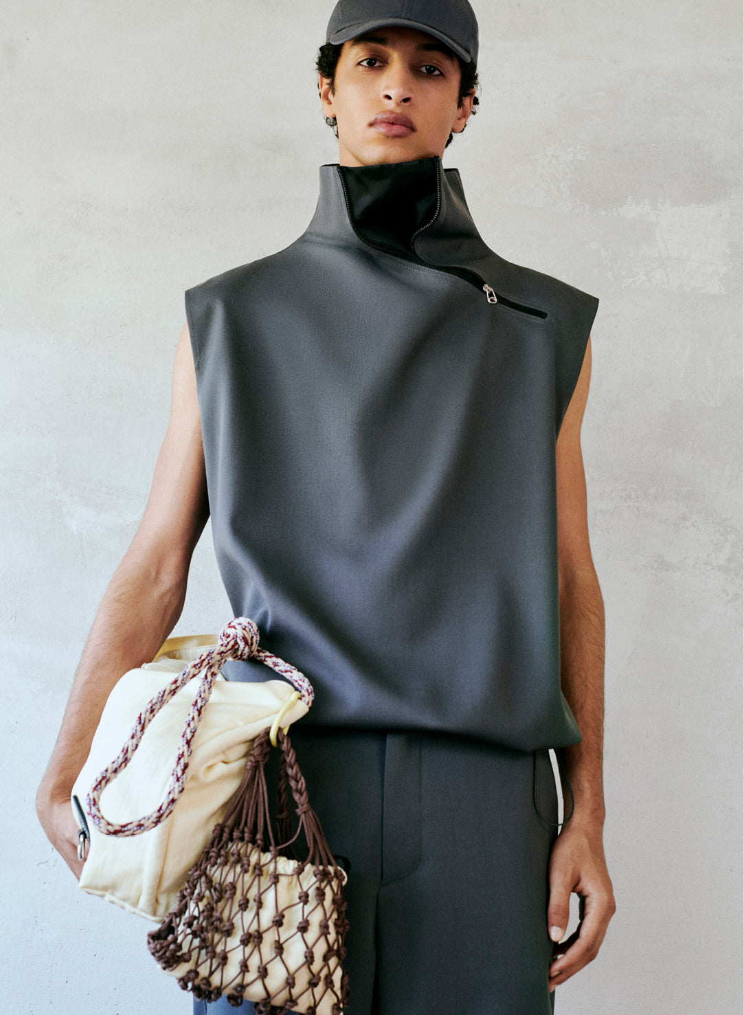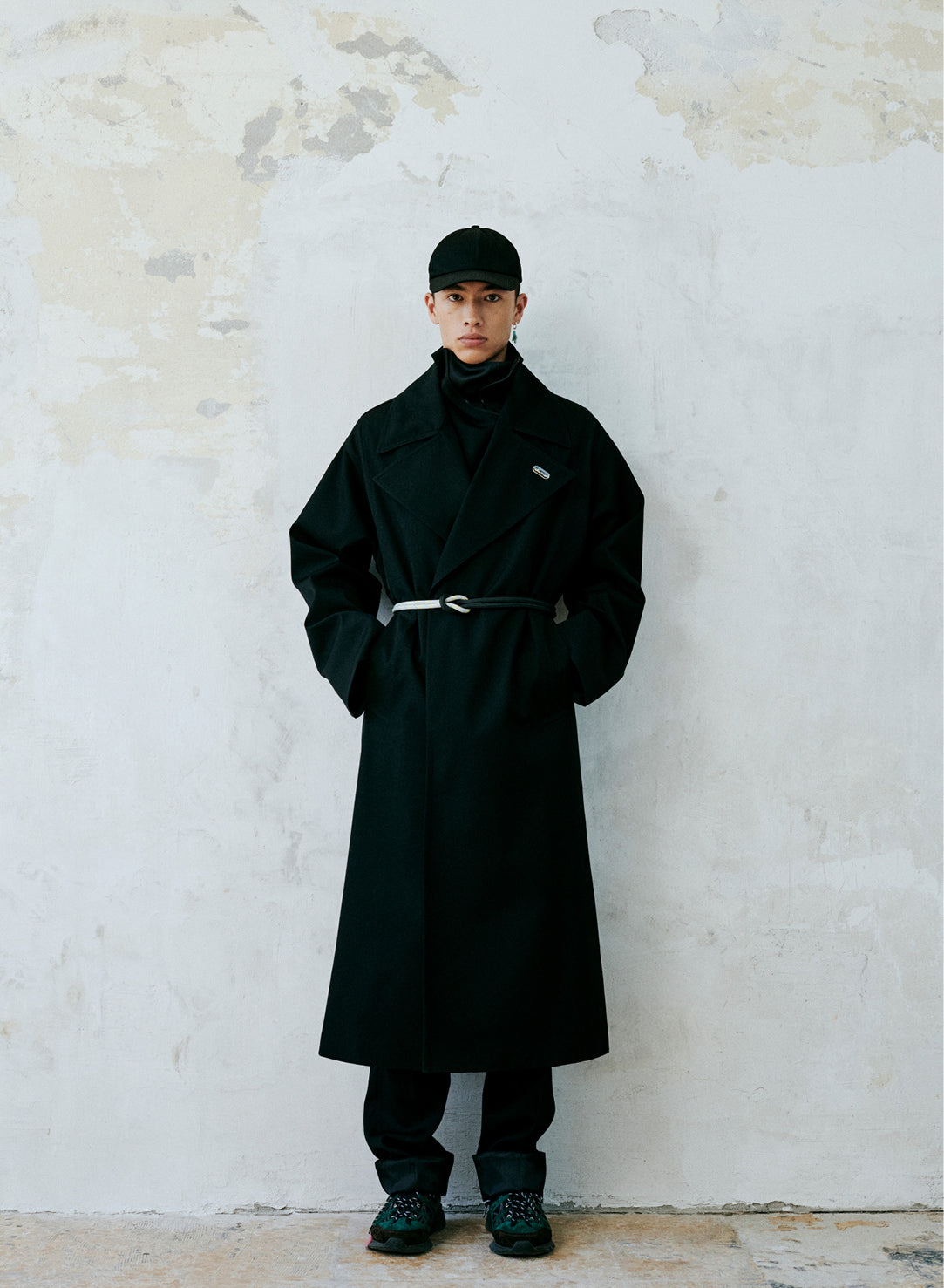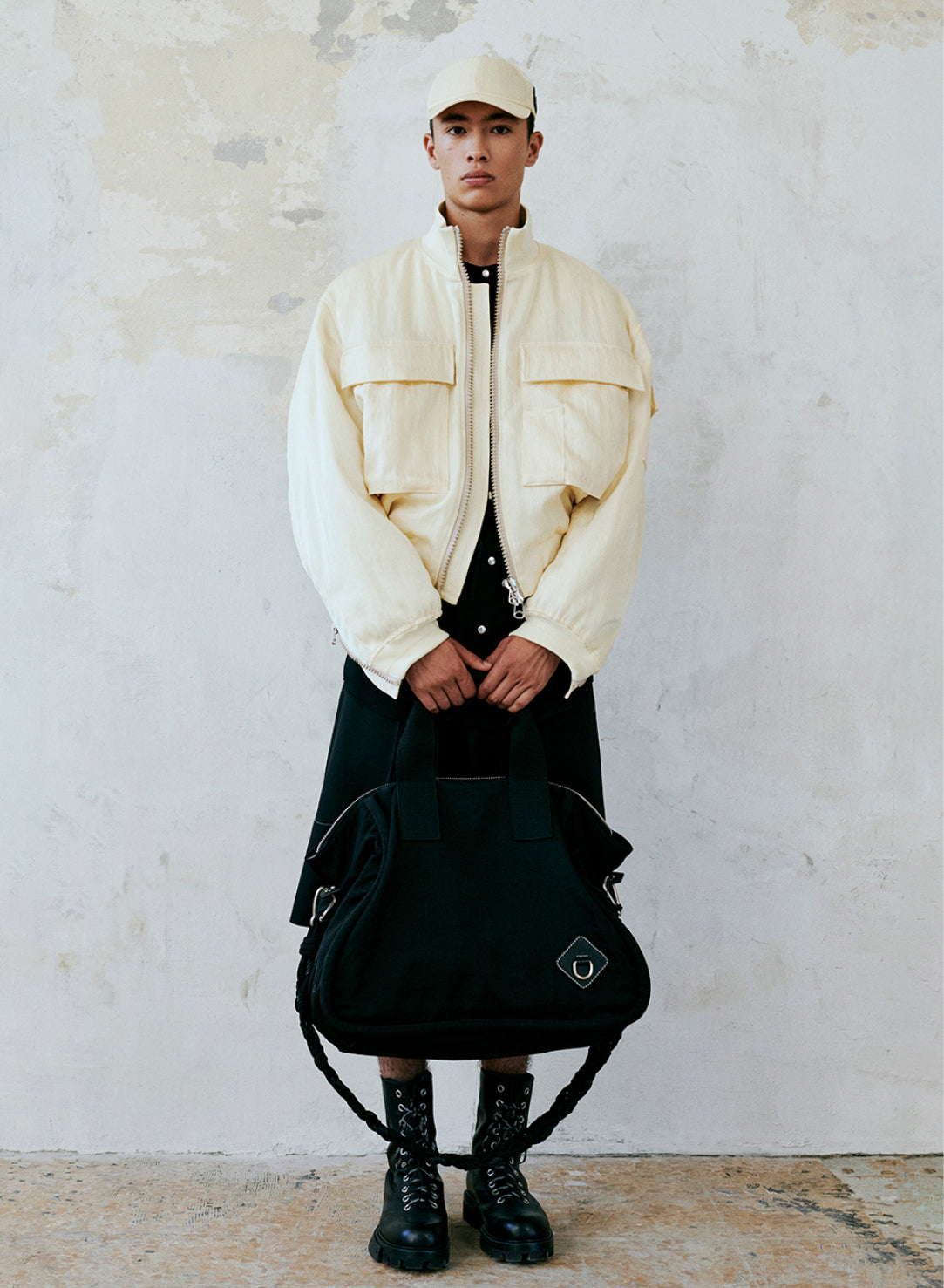シューズやスニーカーも、アウトドア感覚を持ち合わせています。ヴィンテージ調のトレイルランニングシューズからインスピレーションを受けた素材の配合や色遣いは、自然環境に対抗する機能性と強い躍動感を想起させます。OAMC独自のアウトソールを採用した新作スニーカーは、取り外しても使用できるオーソライトインソールと、コントラストが美しい、シグネチャーのサイドグリップディテールが特徴です。ジュエリーは生命力と重厚感がポイントとなり、彫刻された鳥やビーズ製のネックレスで高山に広がる生態系の高貴さをさらに引き立てました。さらには、パウダーコーティング加工で仕上げたマットメタルのチェーンを登山用ロープに組み合わせています。アクセサリーは幾何学的なラインの、ソフトで立体的なバッグが特徴的。ベルトとしても、肩にかけても、シンプルに手持ちにしても楽しめます。手作業で編み上げたネットバッグも、鮮やかなカラーで展開しています。