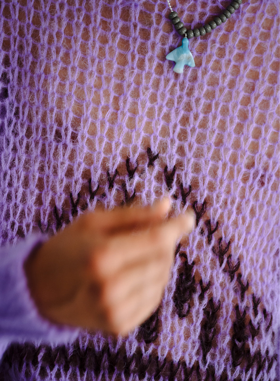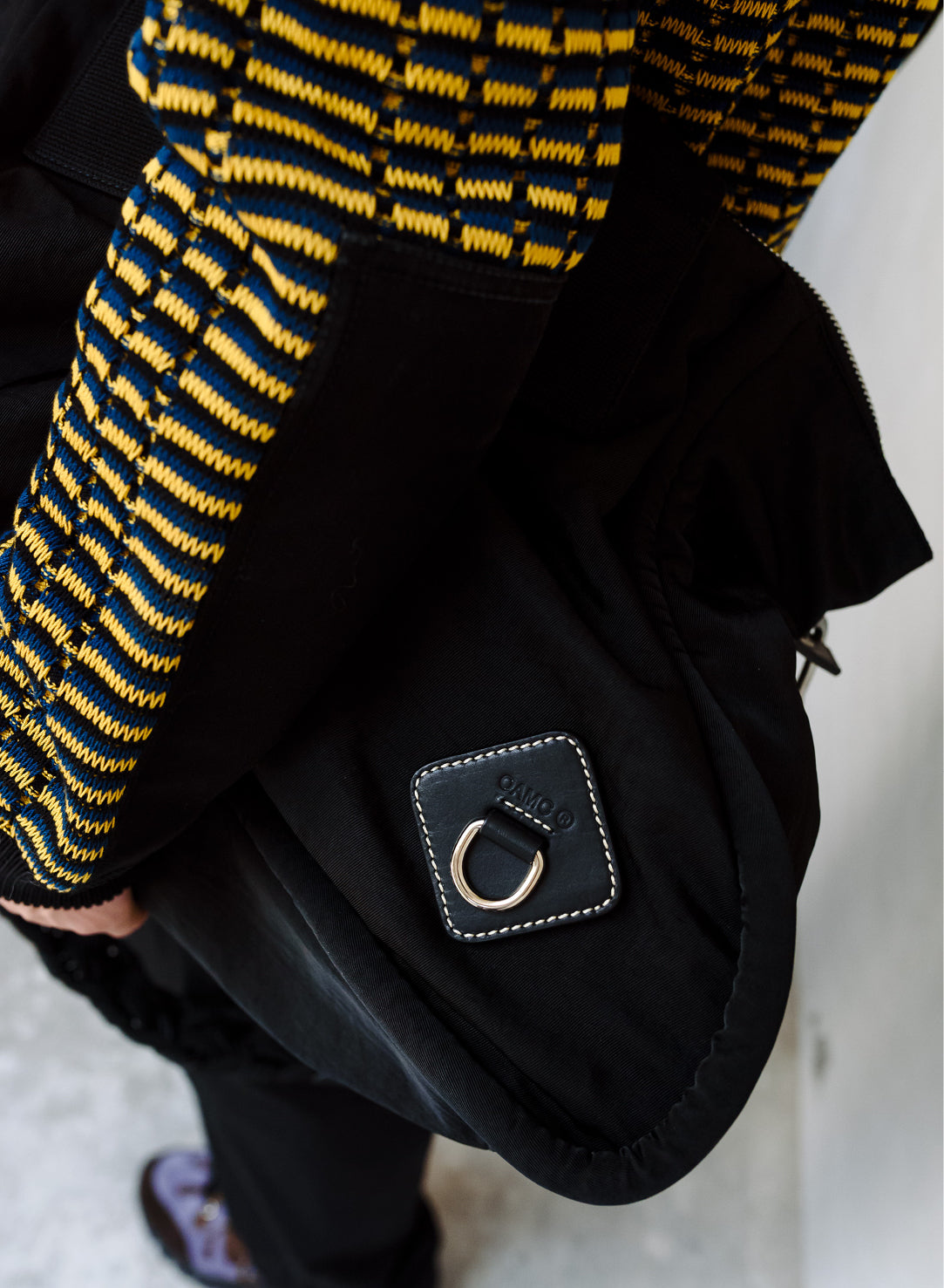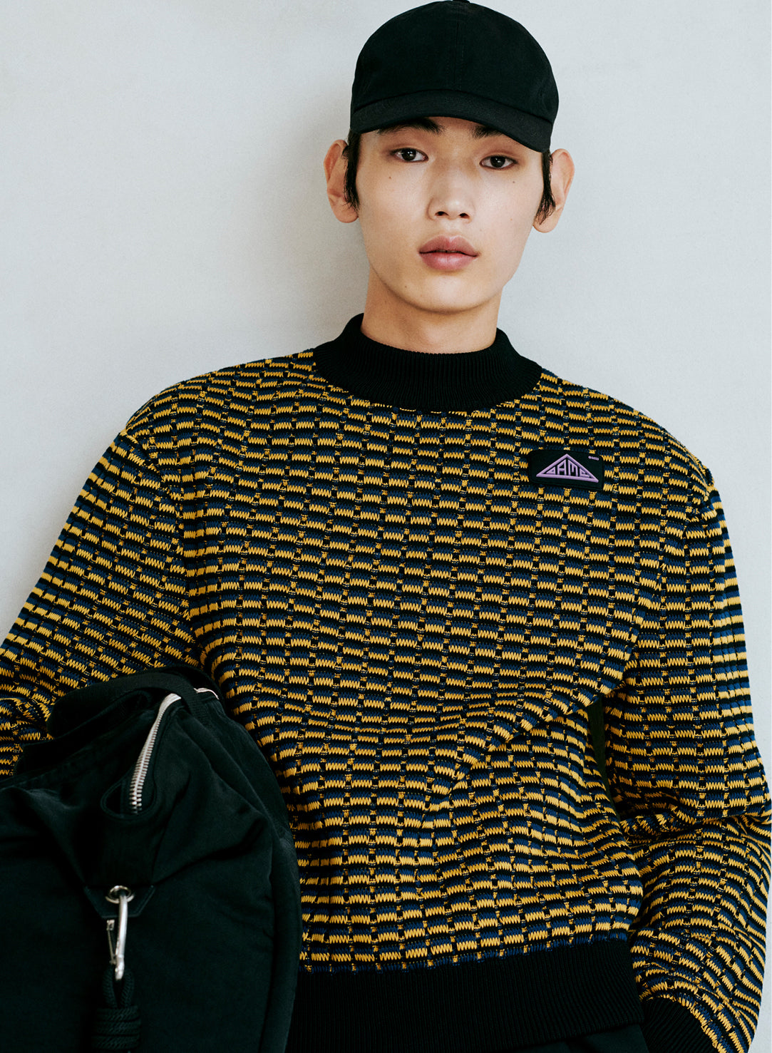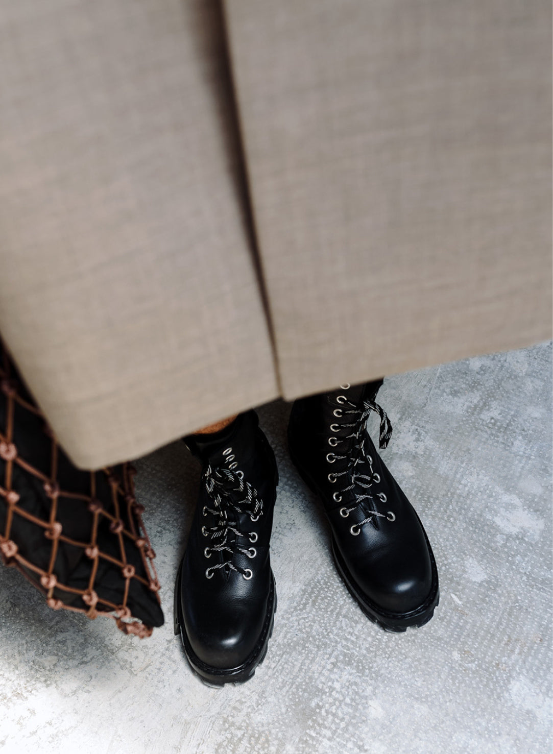 シューズやスニーカーも、アウトドア感覚を持ち合わせています。ヴィンテージ調のトレイルランニングシューズからインスピレーションを受けた素材の配合や色遣いは、自然環境に対抗する機能性と強い躍動感を想起させます。OAMC独自のアウトソールを採用した新作スニーカーは、取り外しても使用できるオーソライトインソールと、コントラストが美しい、シグネチャーのサイドグリップディテールが特徴です。ジュエリーは生命力と重厚感がポイントとなり、彫刻された鳥やビーズ製のネックレスで高山に広がる生態系の高貴さをさらに引き立てました。さらには、パウダーコーティング加工で仕上げたマットメタルのチェーンを登山用ロープに組み合わせています。アクセサリーは幾何学的なラインの、ソフトで立体的なバッグが特徴的。ベルトとしても、肩にかけても、シンプルに手持ちにしても楽しめます。手作業で編み上げたネットバッグも、鮮やかなカラーで展開しています。