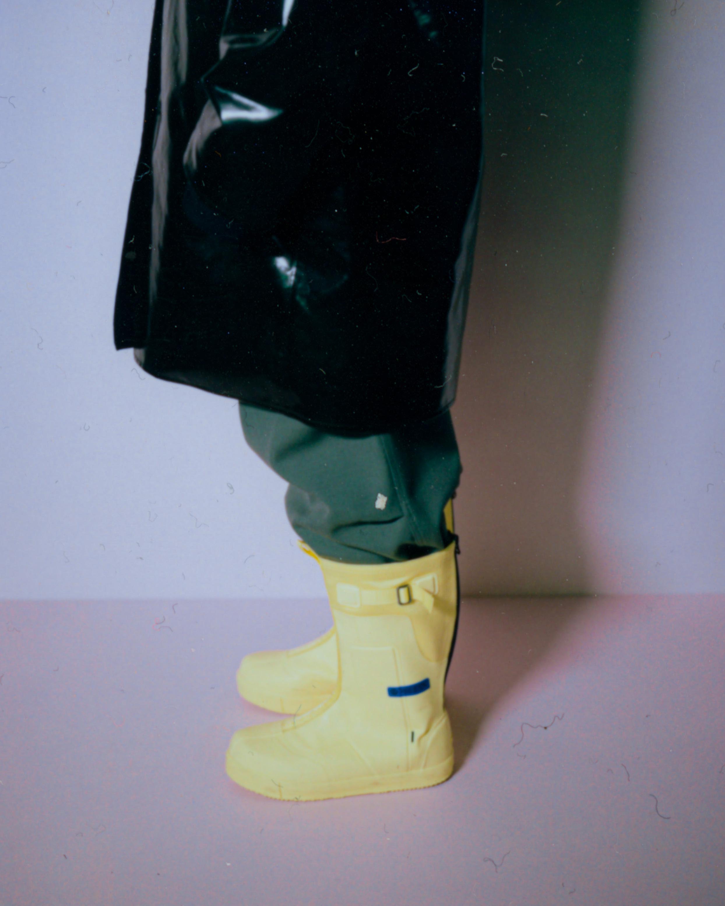 Explorations of softness are present. Vertical quilting on compact cotton is elongated and elegant, while more military-inspired garment-dyed nylon quilting becomes rounded with oversized, cinched and darted trousers. Fully vulcanized hammerhead-toed boots underline a protective feeling. Inflated coats in functional coated cottons, and felted wool topcoats are belted with traditional kimono cords from Japan. Photos by Daido Moriyama are found on cotton matelassé and open-stitch knit, a contrast between his high-contrast reality with soft, comforting textures.